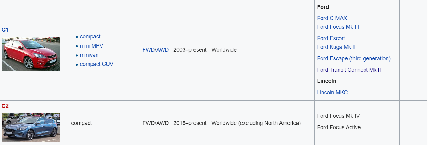 Der Connect lag bisher auf der C1. Die nächste Generation wird dann vermutlich auf C2 liegen und wäre auch abgedeckt. Also liegt der Connect sogar auf der Focus-Klasse (Wenn man den als Repräsentation der Plattform nimmt) und der Courier auf der Fiesta-Klasse.Vielleicht möchte ich auch unbedingt das es weiter eine angemessene Plattform gibt. Aber ich kann mir auch nicht vorstellen das die Plattform vom Edge, Mondeo usw. aus dem Programm fliegt.