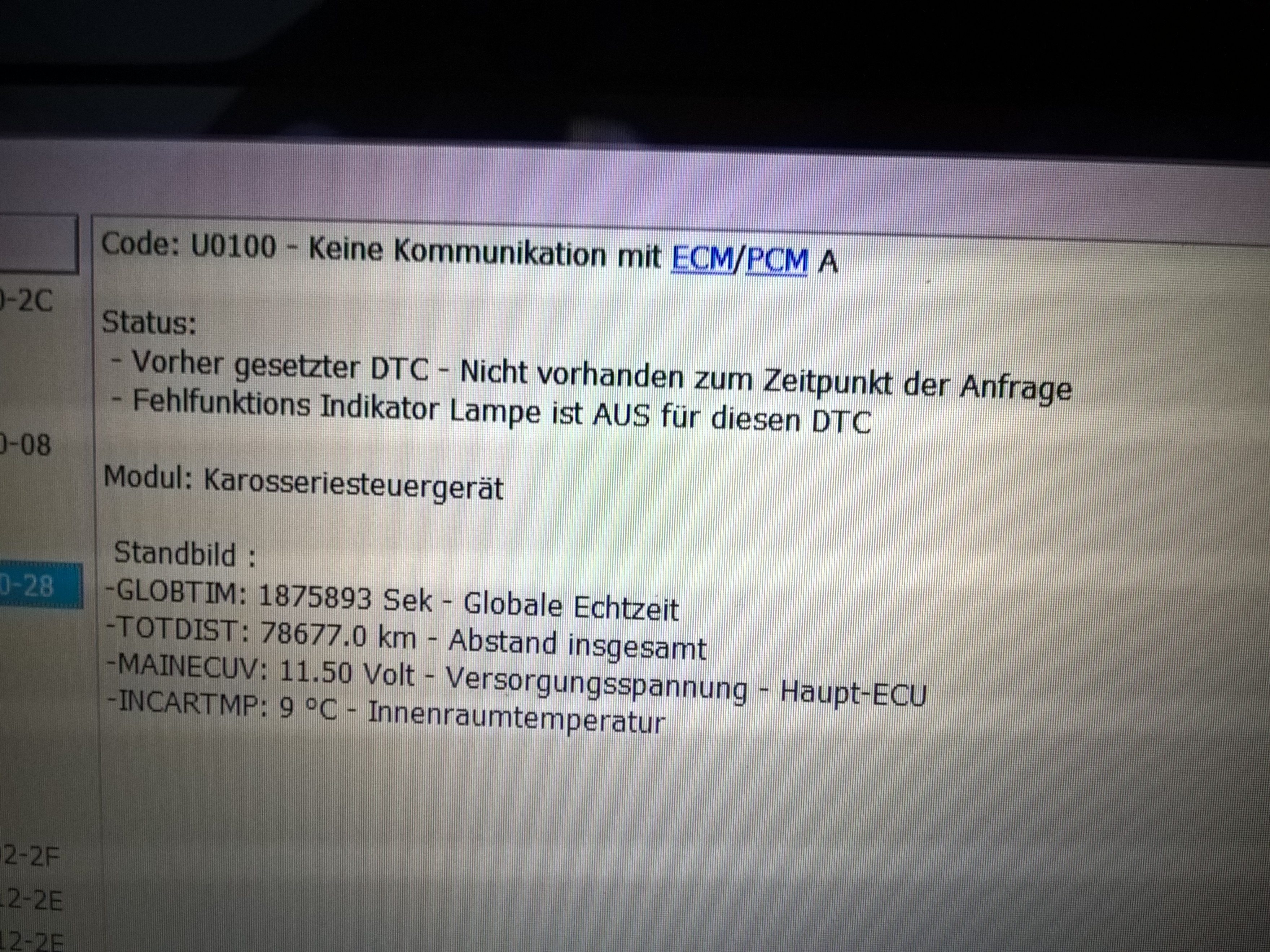 Ich habe gerade Fehler ausgelesen. Auch zeigt er falsche werte im stand an. Kühlwassertemp -11 grad. Dann Zündung aus, an und da stehen 9 grad.
