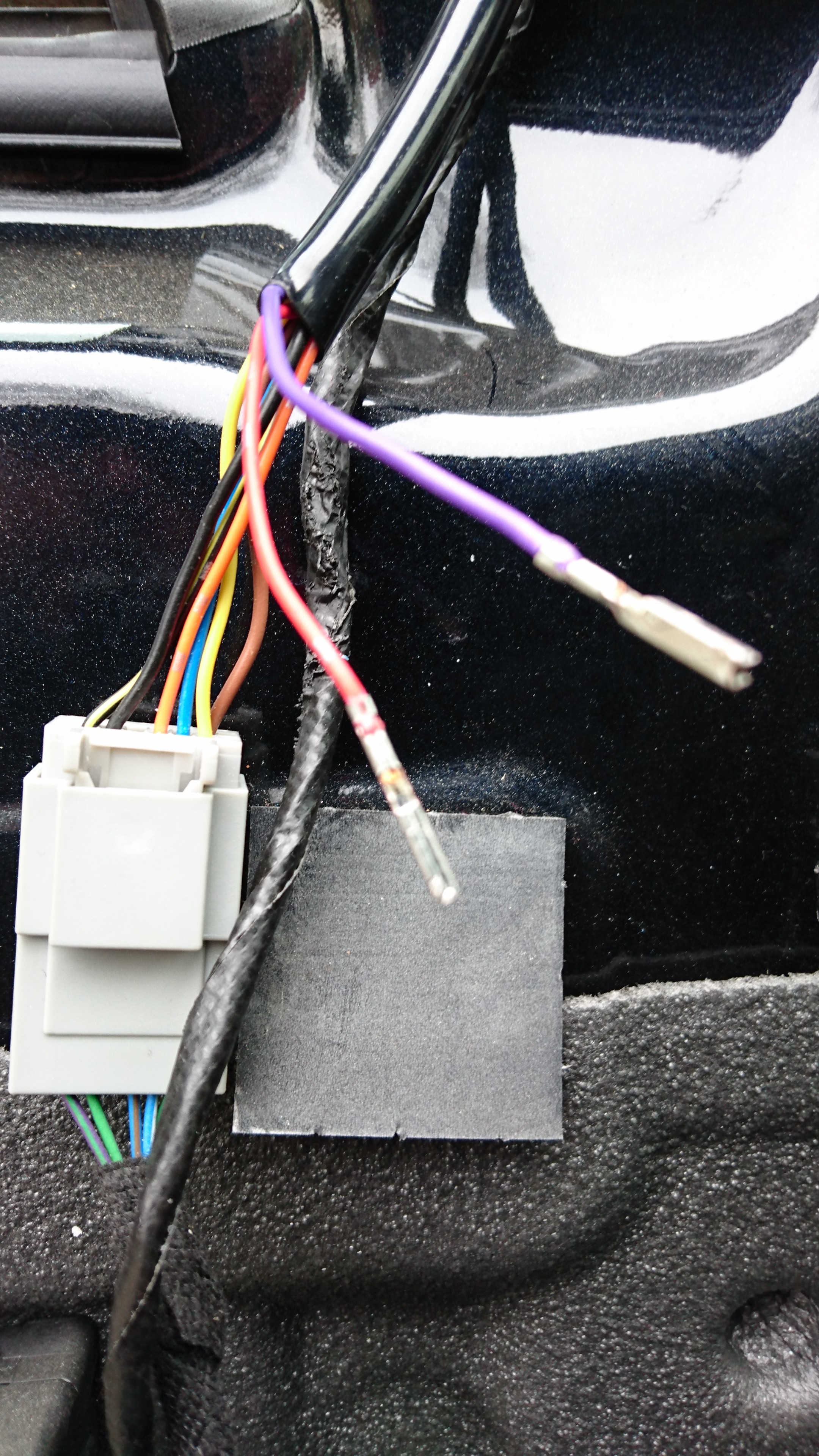 Da mein Kabelbaum die zwei notwendigen Kabel nicht hat, habe ich das rote und das violette Kabel aus dem Stecker vom neuen Spiegel gefriemelt und abgeknippst. Die beiden abgeknippsten Enden mit dem "Schuh" in den Stecker am Türmodul gesteckt und mit einem KFZ-Stecker aus dem Zubehör verbunden (siehe Bilder).