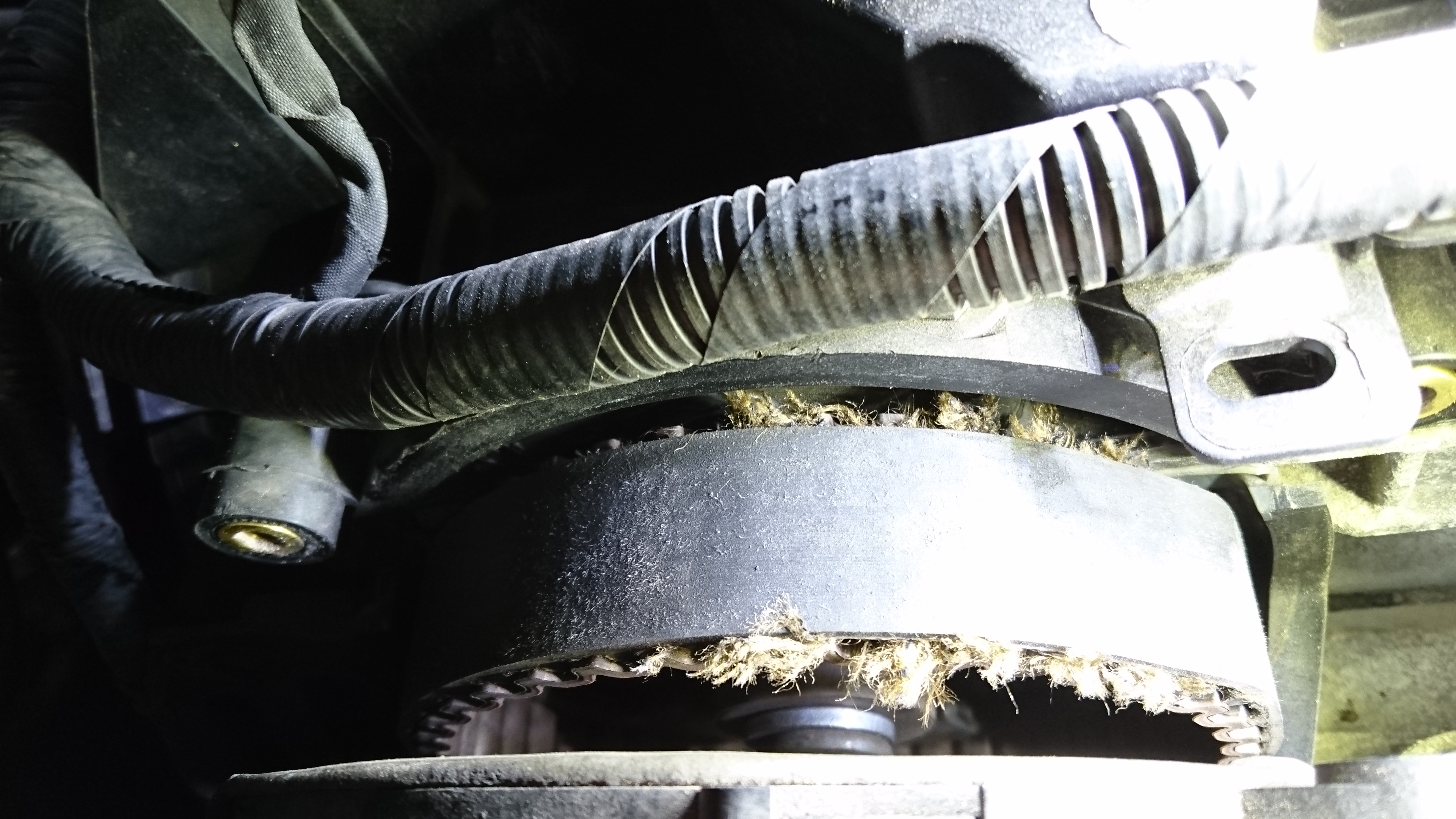 Der Zahnriemen sitzt fest also stramm wie er soll und sieht bis auf 10 cm gut aus (hat jetzt ca. 80.000 km gelaufen, zwei Jahre alt). Ein oder zwei Zähne stehen Zahn auf Zahn und der Riemen ist in dem Bereich ausgefranzt (Bild).