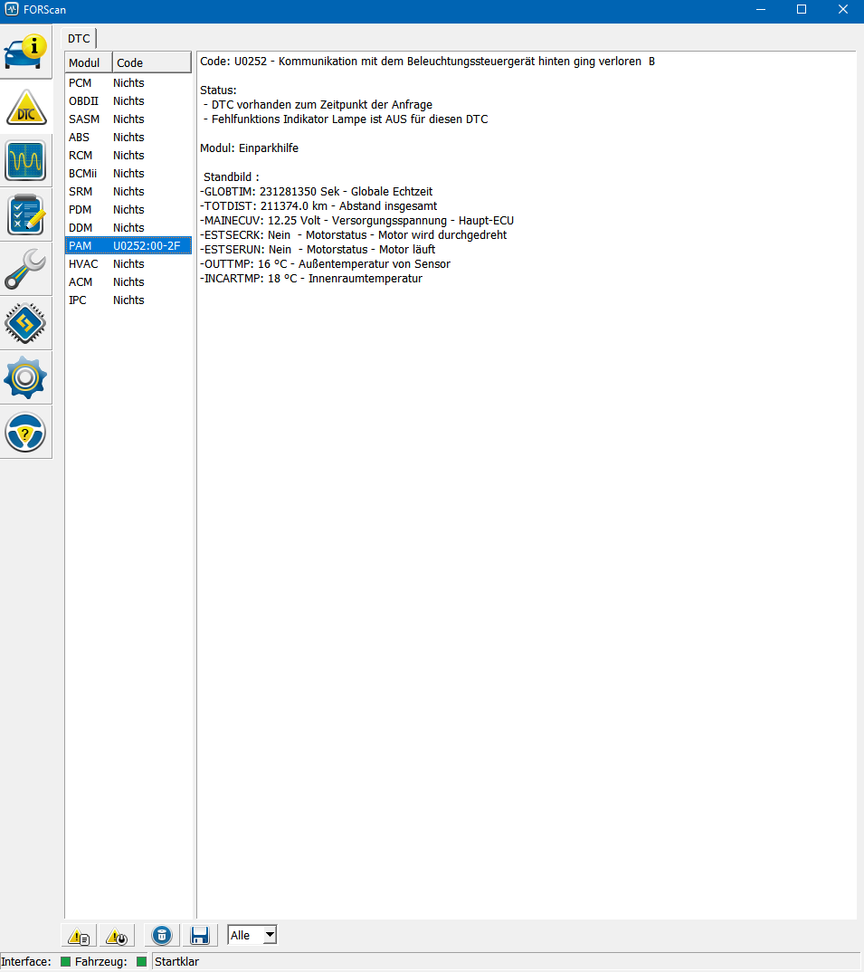 PDC geht nicht mehr, Beleuchtung ging alles ohne Probleme ,Eintrag im Fehlerspeicher ( Screenshot im Anhang) und die Aufzeichnung vom MSCan ergab folgendes (im Anhang "SiffermodeahkAktiviert")