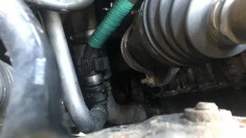 Der Schlauch ist mittig hinten oben am Motor angeschlossen. Auf der anderen Seite ist er mit einer Steckverbindung auf einem anderen Schlauch direkt über der Antriebswelle gesteckt.