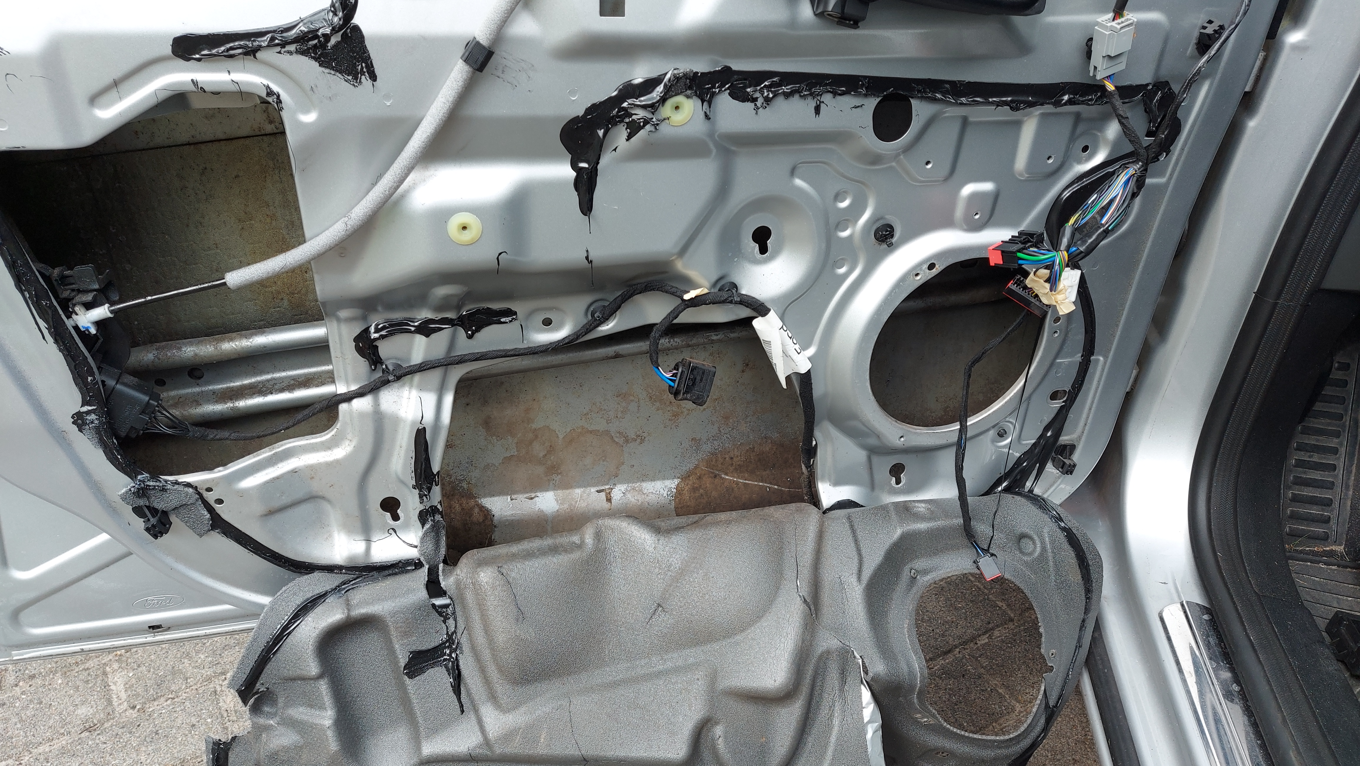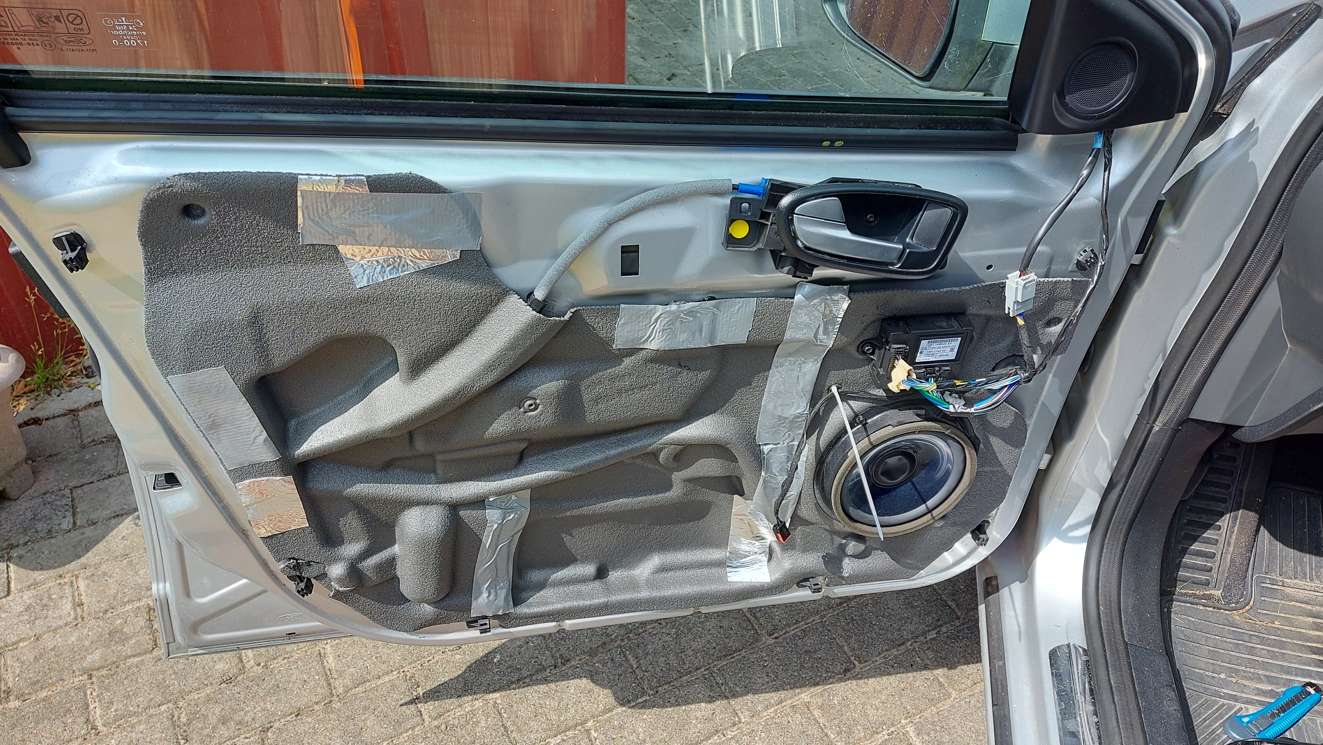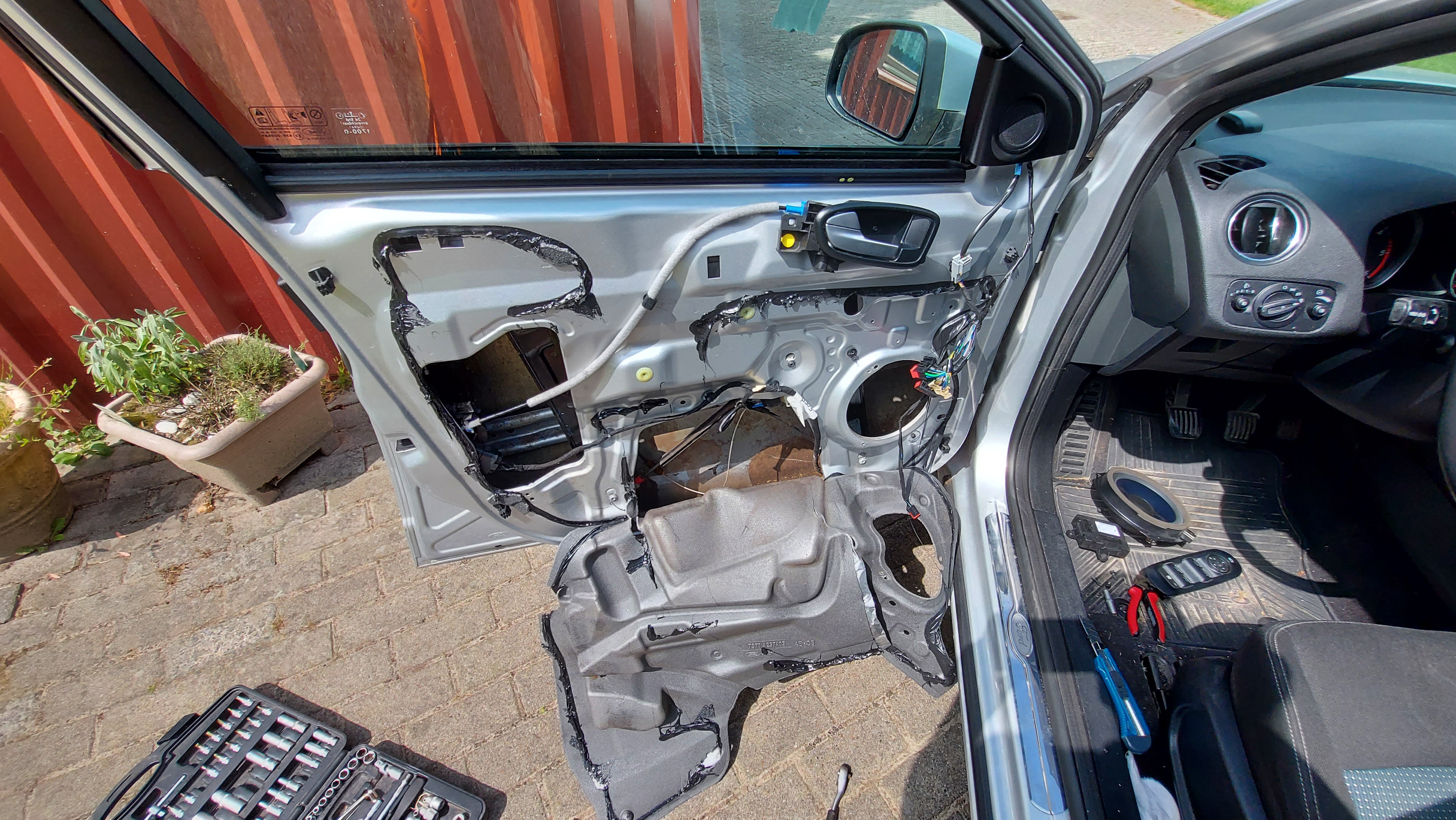 Nun vorsichtig an der Schaumstoffverkleidung ziehen und mit einem Cutter durchtrennen also die Klebemasse zwischen Tür und Schaumstoff meine ich natürlich.
