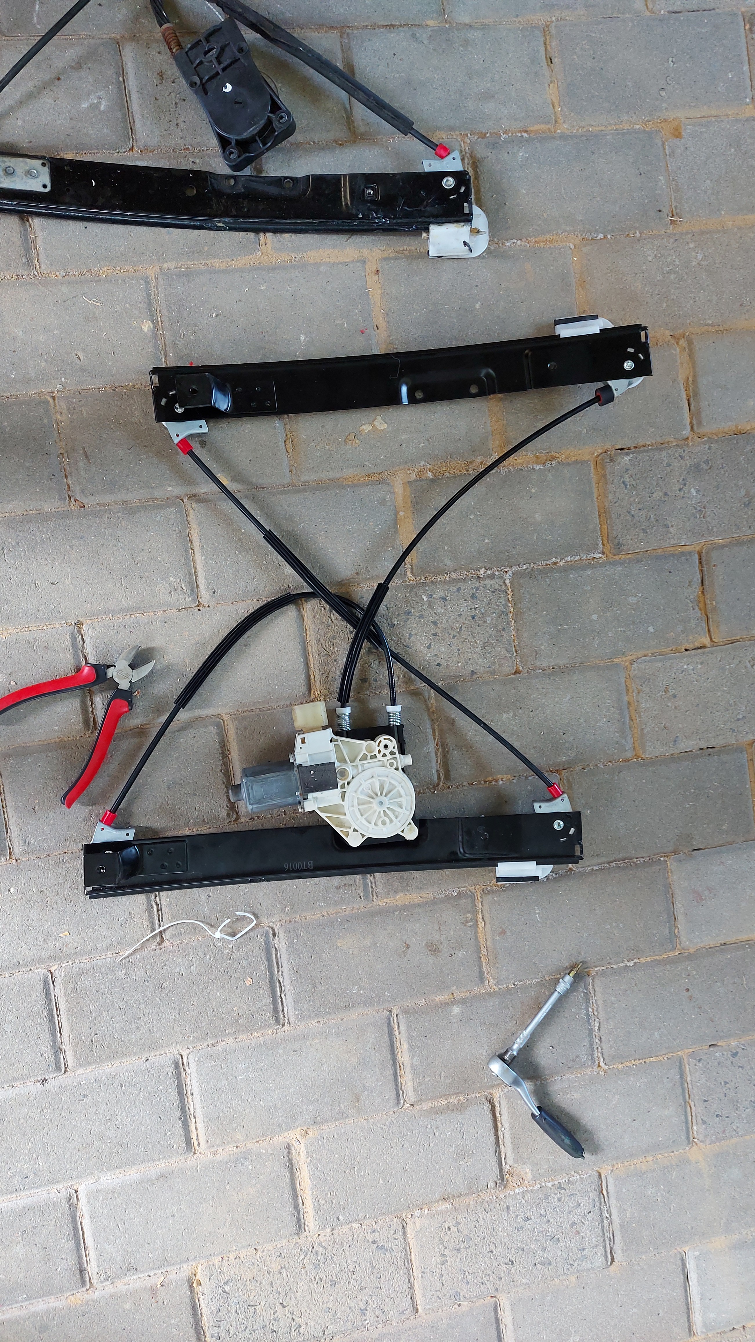 Man kann vorher die Schrauben schon oben und unten in den Trägerschienen befestigen dann könnt ihr den Fensterheber wieder einhaken oder ihr schraubt es erst zusammen wenn es schon drin ist je nach Belieben.