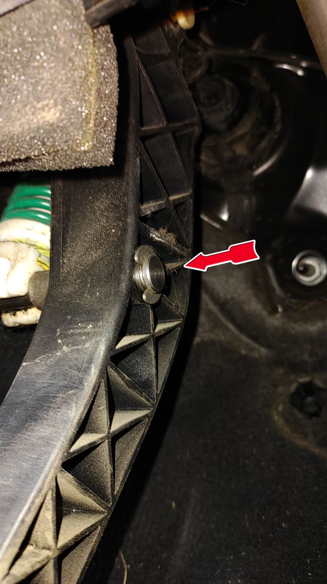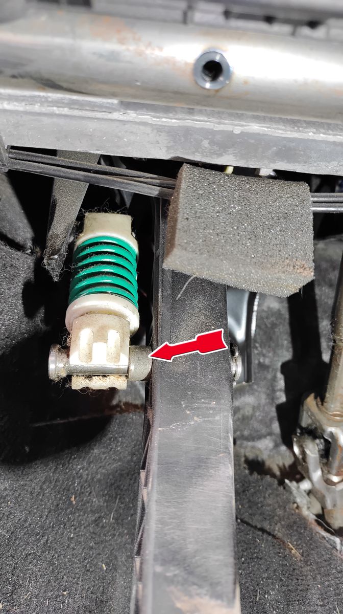 Kupplungspedal bis zum Anschlag durchdrücken und mit einer Zange am Bolzen (Pfeil) nach links rausdrehen
