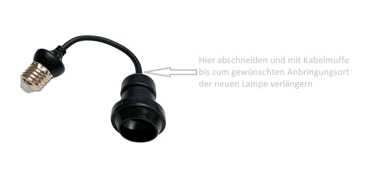 So wars eigentlich nicht zu verstehen. Muss es denn unbedingt eine Lampe mit Stecker sein? Du sollst das Kabel mittels der Muffe bis zur neuen Lampe verlängern und dann direkt an diese anschließen. Nix Fassung gegen Schwein tauschen.