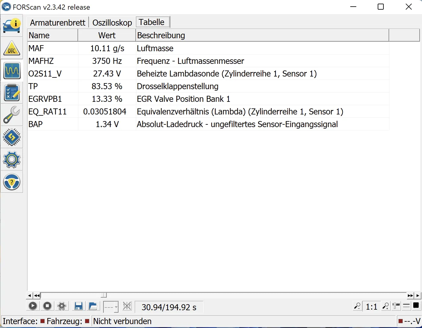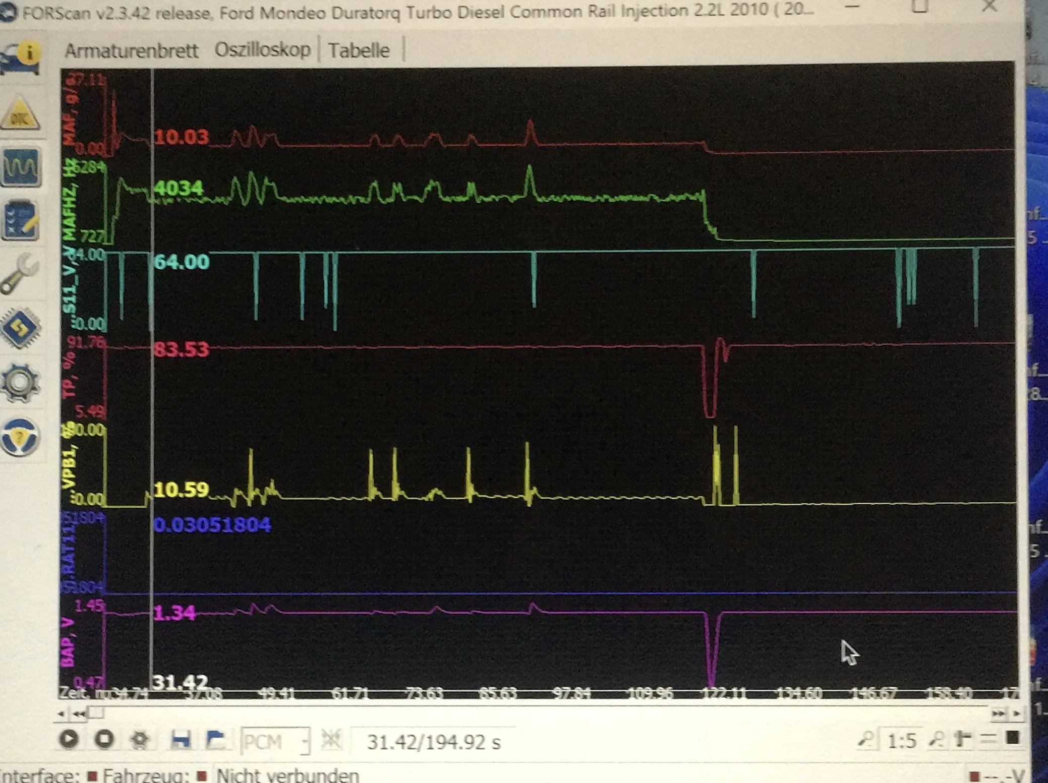 Mit dem Forscan Tool habe ich ausgelesen, dass etwas mit der Lambdasonde nicht stimmt. Es werden aber Werte angezeigt - nur die sind jenseits von Gut und Böse um die 60 Volt, aber beim Gasgeben verändert sich der Wert auch ein bisschen.