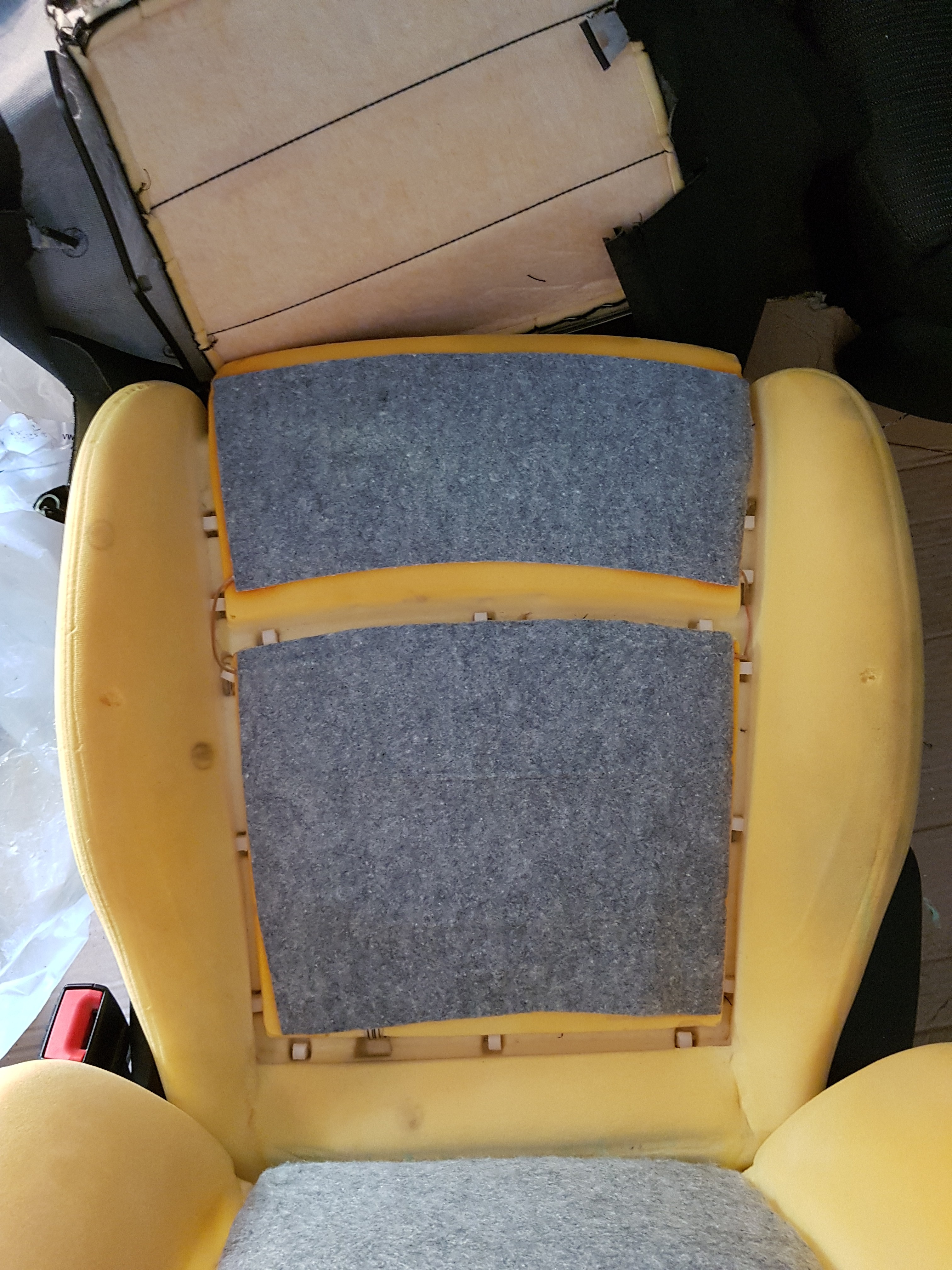 Verstehe, das war mein "missing link". Man muss also schon zuerst die Bezüge runtermachen. Ich hatte die (naive) Vorstellung, dass man die Bezüge am Schaumstoff lassen könnte und somit bis auf die Sitzkonsole alles als ein ganzes Stück vom Spender übernehmen könnte