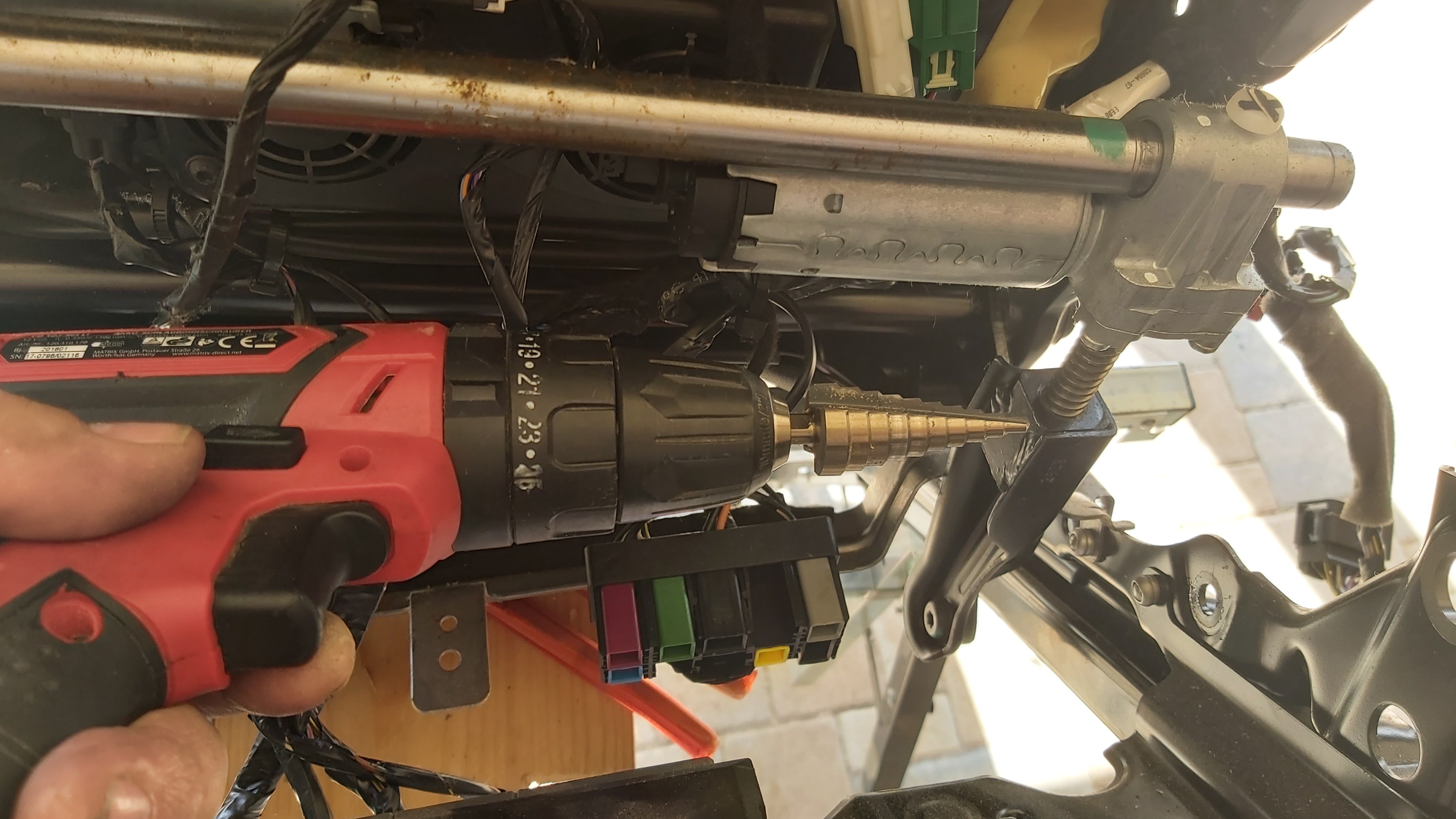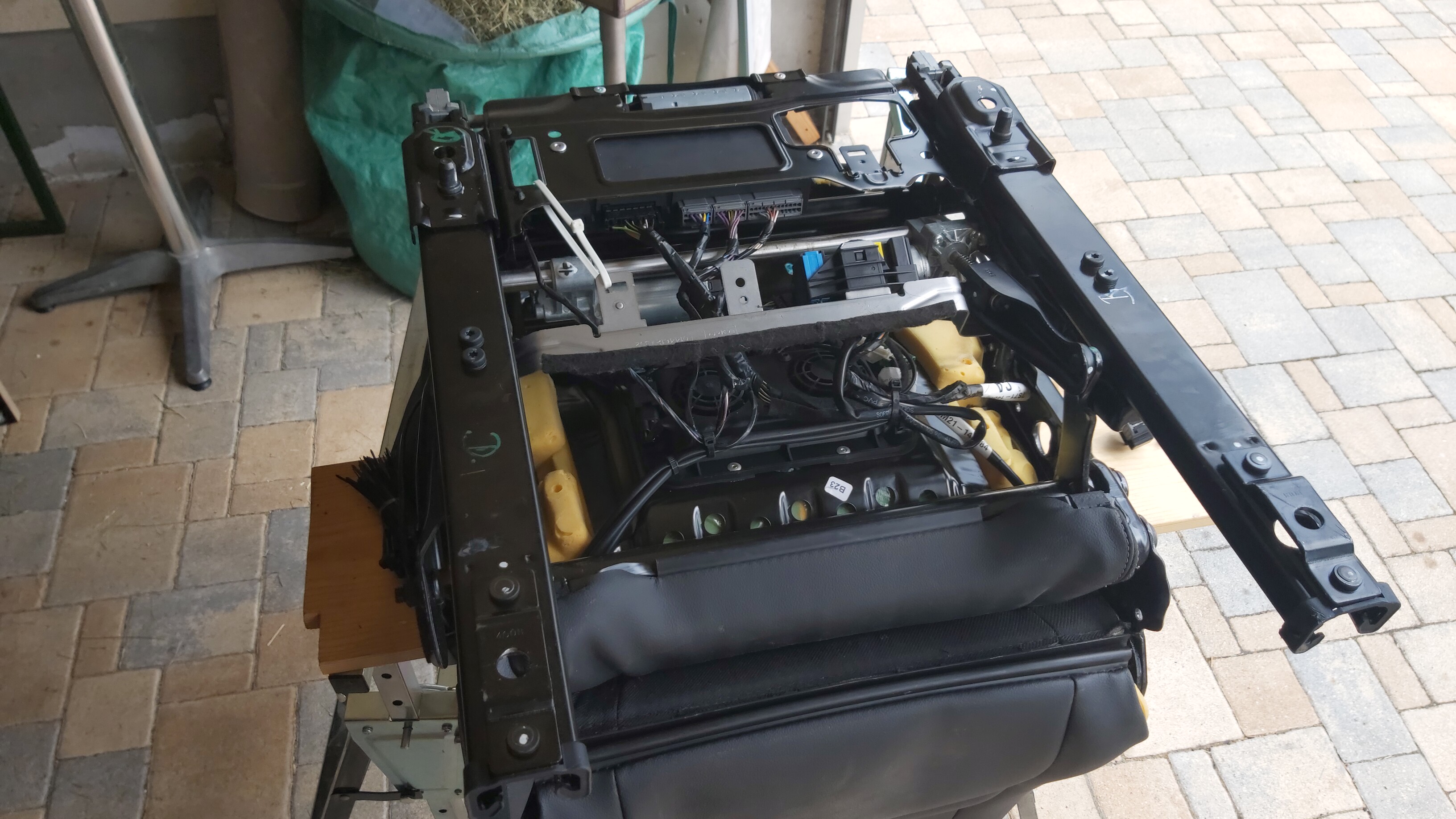 zum Ablauf: zuerst habe ich die beiden hinteren Konsolen Schrauben der Sitzkonsole unten raus geschraubt, dann den Sitz nach hinten gefahren, dann die vorderen Schrauben heraus geschraubt. Anschließend habe ich den Sitz nach hinten gekippt, und die kleine Siebener Schraube vom Stecker des Kabelanschlusses am Sitz gelöst. Kleiner Hinweis noch: es empfiehlt sich, die Rückenlehne in die vorderste Position zu kippen, und den Sitz dementsprechend vorm Herausschrauben der hinteren Schrauben nach vorne zu fahren bzw vor dem Herausschrauben der vorderen Schrauben nach hinten zu fahren. Dann habe ich den Sitz herausgeholt, ihn auf zwei Böcken platziert. Dabei habe ich ihn auf den Kopf gestellt. Anschließend habe ich, um die untere Sitzkonsole vom Sitz trennen zu können, die vier Anschlussstecker am Steuerteil vom Sitz abgezogen. Danach habe ich die kabelbefestigungen vom Gurtschloss und den Stecker am vorderen Stellmotor abgezogen. Anschließend habe ich die vier bewussten Schrauben, die da lose waren, herausgedreht, die entsprechenden alten Hülsen aus den Löchern mit einem 16er Stufenbohrer heraus gebohrt, und den ganzen Kladderadatsch in umgekehrter Reihenfolge wieder zusammengebaut. Nichts wackelt, alles ist schön. Habt ihr noch weitere Fragen, fragt!