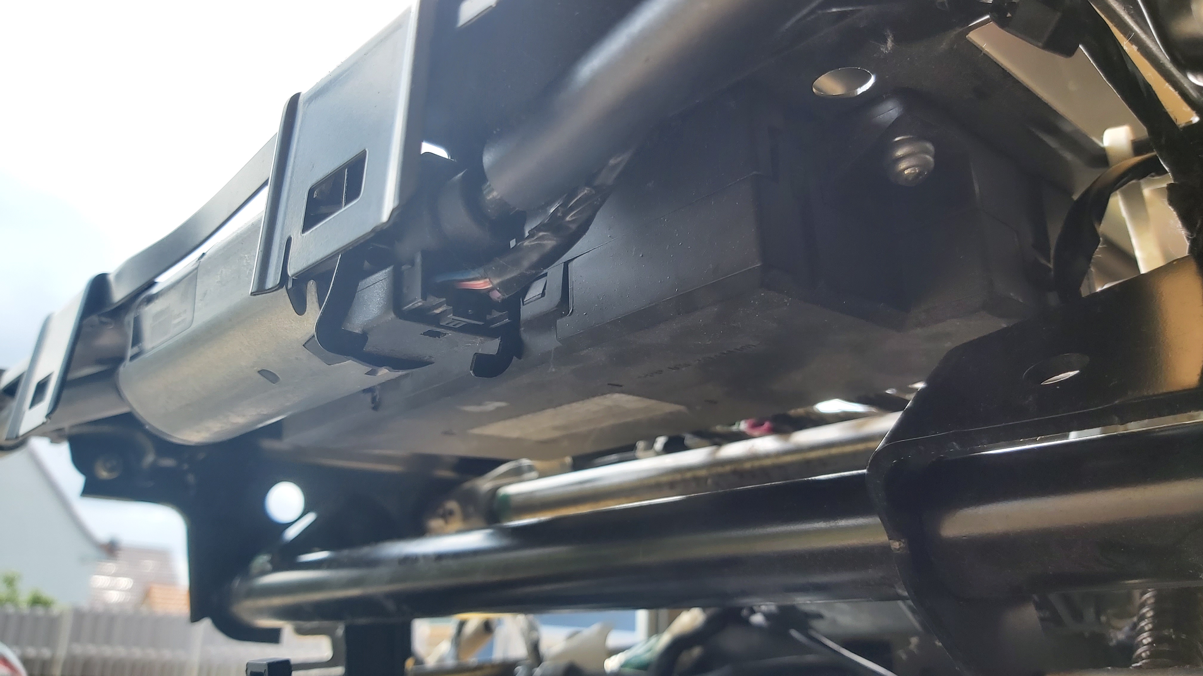Was ich noch vergessen habe: die Seitenverkleidung vom Sitz muss natürlich auch ab. Dazu ist am hinteren Ende von der Innenseite des Sitzes aus gesehen hinter der Lehne eine kleine Inbusschraube, die dreht man raus, hebelt das Ganze ein wenig nach außen und schiebt dann diese gesamte Verkleidung mit einem kräftigen Ruck nach vorn. Schon ist sie lose. Anschließend werden noch die beiden Stecker von diesen Stellknöpfen abgezogen.