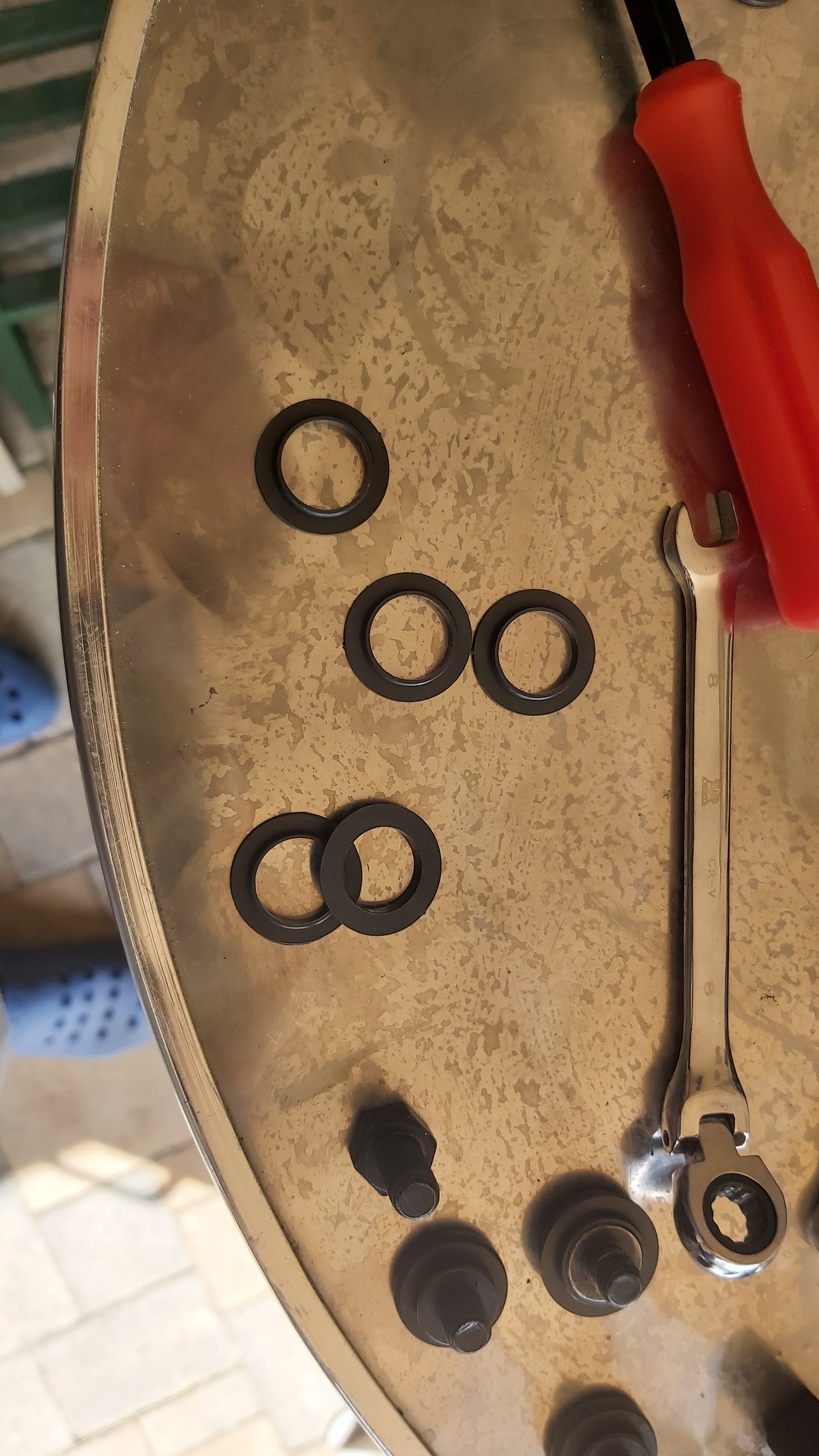 Den Gurthalter abbauen lohnt sich nicht (ich habe alle 4 Buchsen gewechselt). Die Schraube hinter dem Gurthalter habe ich mit dem 35er (?) Inbus und einem 8er Ratschenschlüssel bewegt.