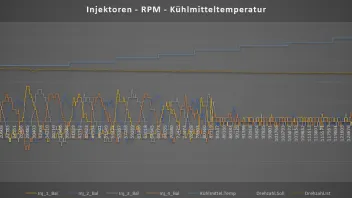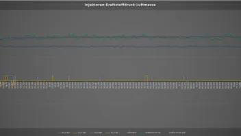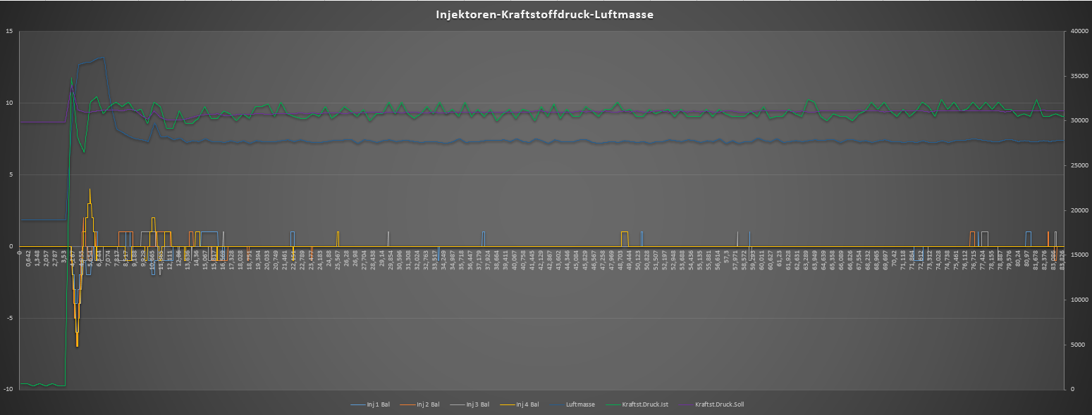 Die letzte interessante Grafik enthält Kraftstoffdruck und Luftmasse. Da gibt es einen starken Peak nach dem Motorstart und dann nimmt der Wert stätig mit der Drehzahl ab, mit permanenten leichten Schwankungen. Vermutlich i. O., da der Luftmassen-Wert-Peak mit der Drehzahl korreliert.