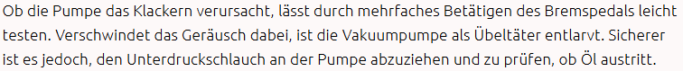 Die Umstände deuten mittlerweile auf die Vakuumpumpe. Ich hatte heute den Motor angeschmissen und habe einige Minuten gewartet, bis er warm wurde und zu klackern anfing. Dann habe ich 3-4 Mal kräftig auf die Bremse getreten - und schon war das Klackern weg. Nach 20-30 Sekunden fing er wieder zögernd an zu klackern (also unregelmäßig - aber zunehmend). Erneut 2-3 Tritte auf das Bremspedal - Klackern weg.