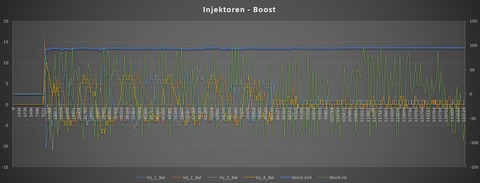 So ein Herumschwimmen der Ist-Werte im Vergleich zum stabilen Soll-Wert kann doch nicht normal sein? Es hat aber scheinbar keinen Einfluss auf die Korrekturwerte. Man könnte sich theoretisch Vorstellen, dass die Werte zu einem Zeitpunkt verworfen werden - das würde jedoch vermutlich mit einem Eintrag in den Fehlerspeicher und Notlauf enden. Den Boost ignorieren wir also.