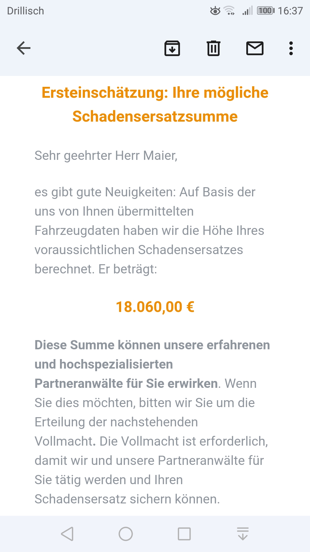Wenn die illegale Einrichtung abgeschaltet ist, verbraucht das Auto mehr. Das führt für den Fahrer zu höheren Kosten und zum Wertverlust. Darauf hat man Schadenersatz. Und darauf richten sich die Klagen. Also wieviele KM man gefahren hat und welchen Zeitwert das Auto hat bzw. theoretisch hätte wenn es nicht manipuliert wäre. Das sind in der Regel so Aussage 5000€ im Schnitt. Die Kanzlei reicht das bei der Rechtschutzversicherung ein, die genehmigen und dann wird erst geklagt. Wenn sogar die Rechtschutzversicherung davon weiß und solche Klagen bezahlt, dann kann das wohl keine Bauernfängerei sein. Also klingt erstmal alles ok.