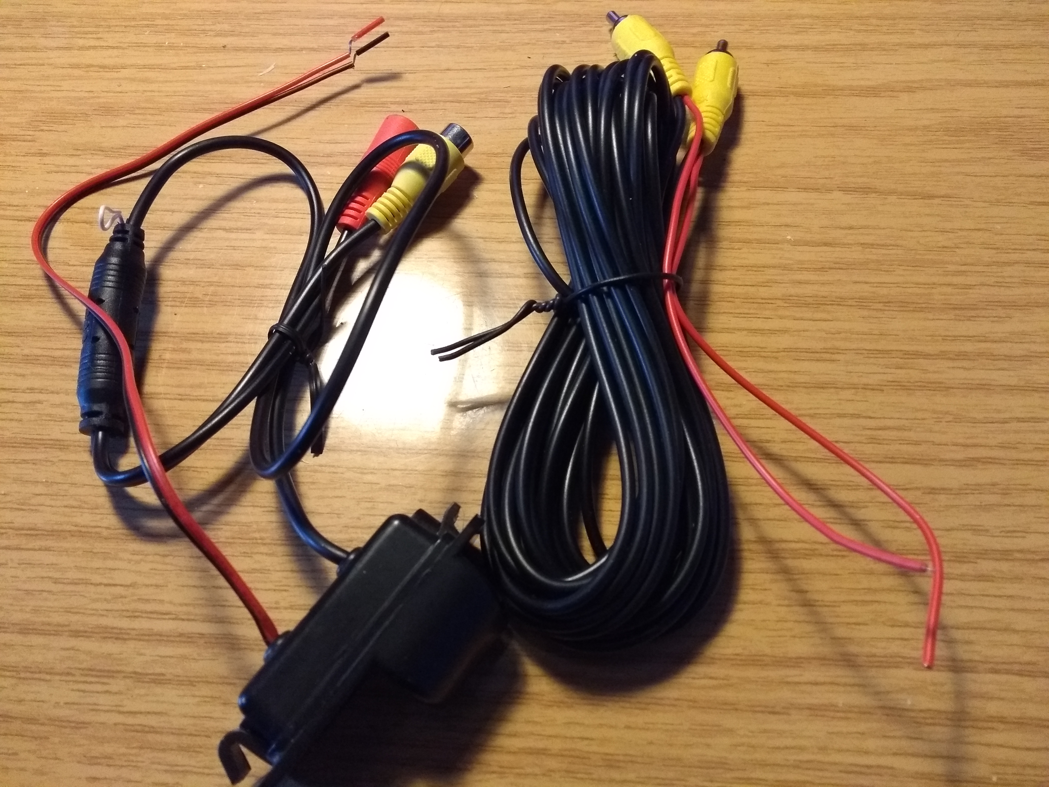 Rechts im Bild ein langes Kabel mit jeweils einem gelben Cinch-Stecker (E) am Ende sowie einem dünnen roten Kabel (F).