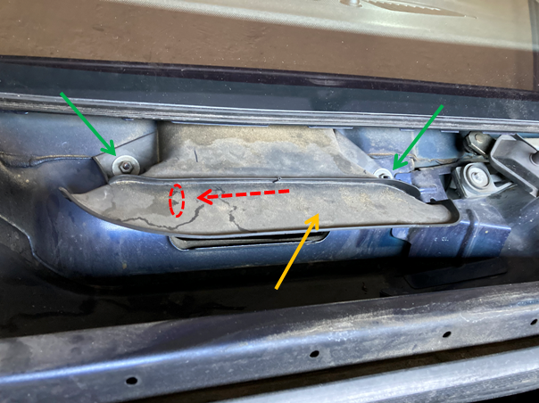 Die Dichtung zur Motorhaube hin ist je nach Baujahr lose eingesteckt oder drangetackert. - Unter dem Windlauf sieht man eine Abdeckung über dem Lufteintritt. Hier die beiden Muttern entfernen (grüne Pfeile) und Abdeckung abnehmen (orangener Pfeil). Darunter ist dann auf der linken Seite die Markierung der Position des Sensors in der Luftöffnung (roter Pfeil).