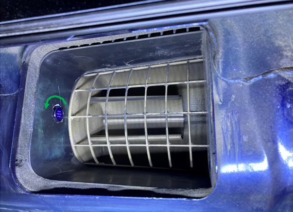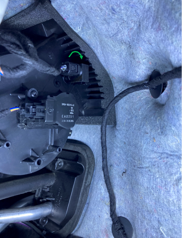 - Im Innenraum Sensor auf den Stecker stecken, danach in die Öffnung einfädeln und durch Drehen im Uhrzeigersinn um ca. 90° verriegeln (vom Innenraum aus gesehen). Die Bilder zeigen den Sensor in Endlage.