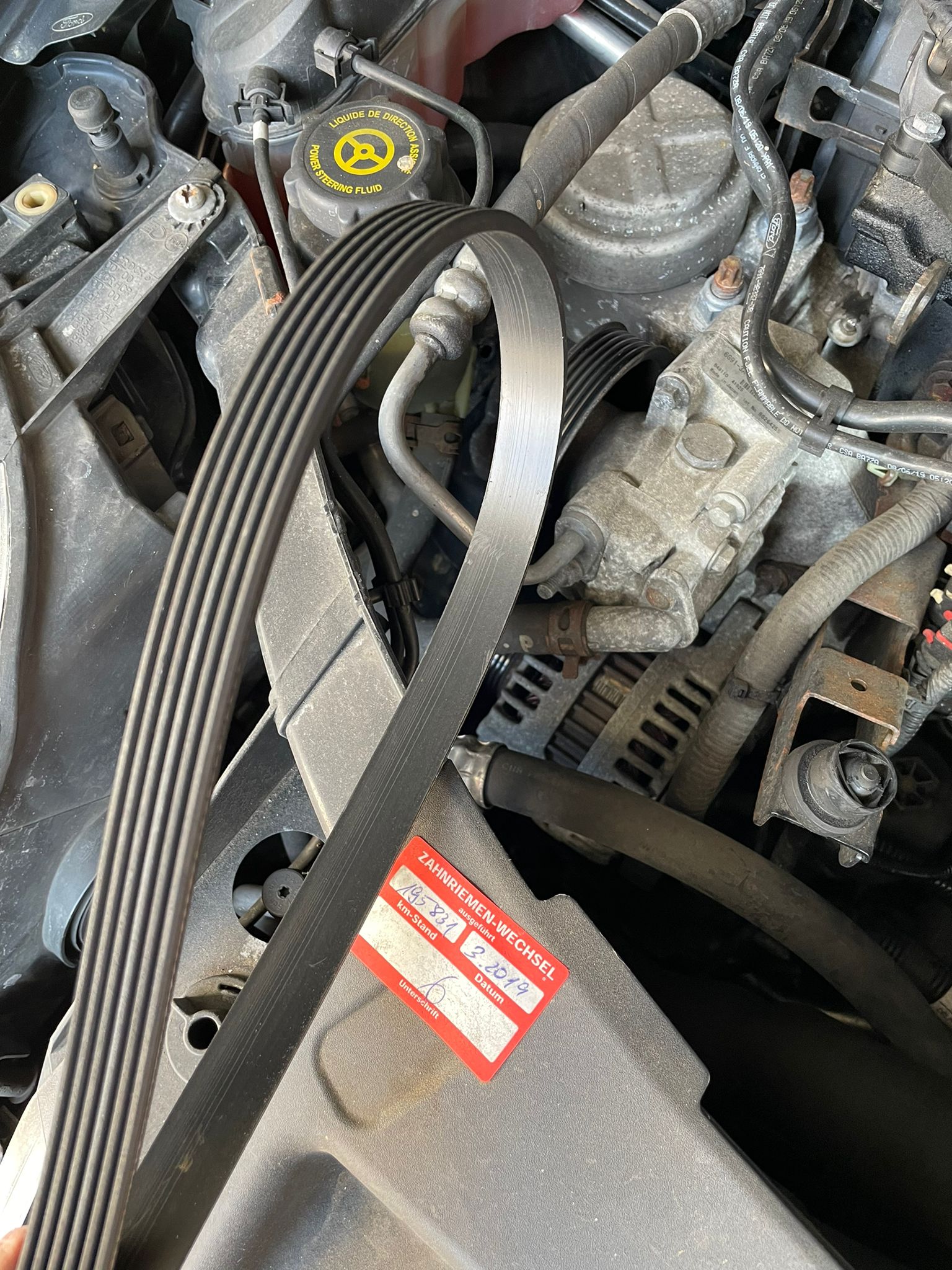 Mit Unterstützung hab ich dann die Motorhaube geöffnet und wir haben festgestellt, dass der Keilriemen (unsicher, ob das die richtige Bezeichnung dafür ist) abgefallen ist. Folgendes hab ich nun schon gelernt: