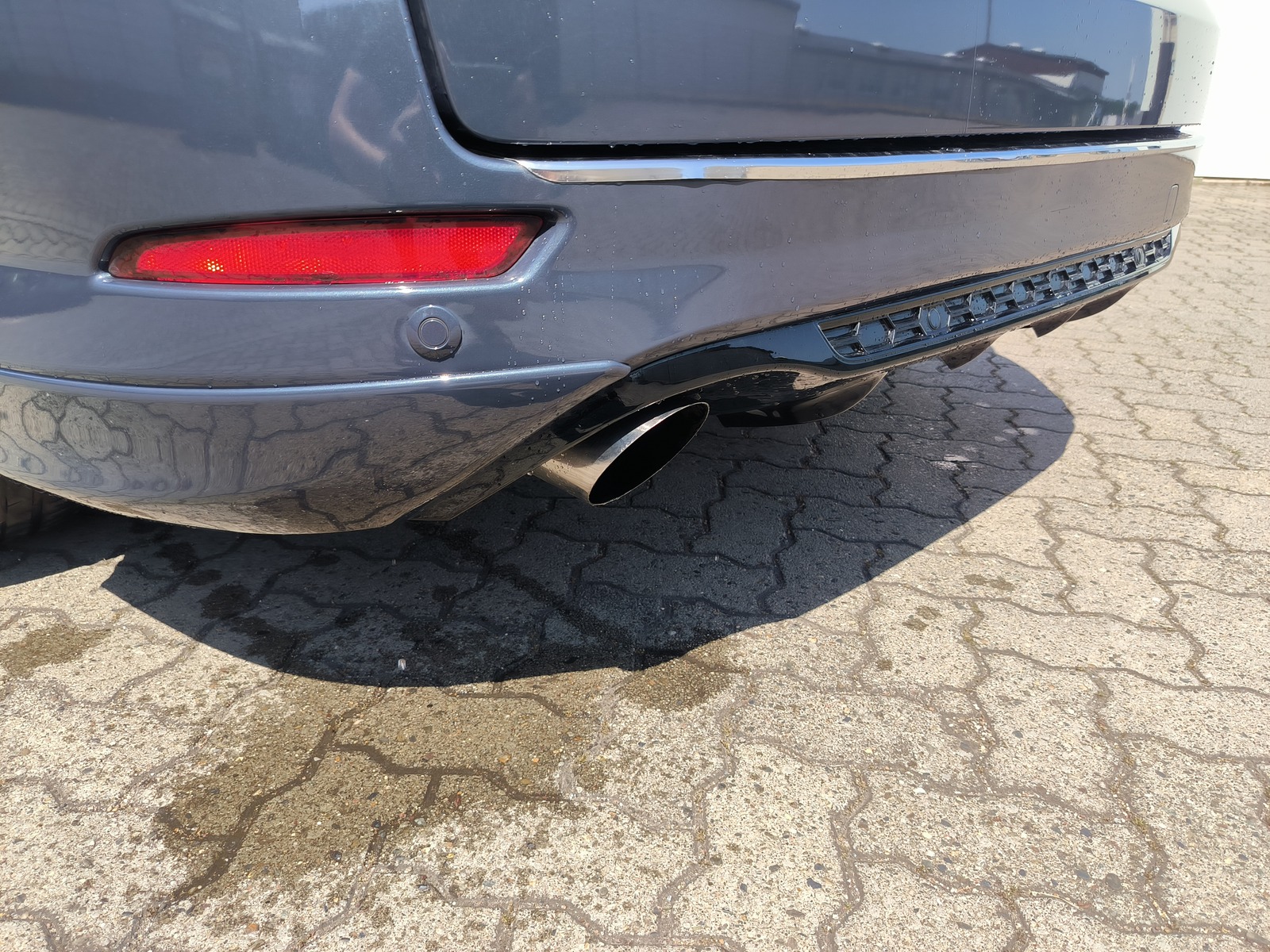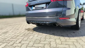 Habe mir einen Duplexauspuff von einer Limo 2.0 Eco Boost besorgt und drunter gebaut, ohne großes Hitzeschutzblech rechts. Die Heckschürze musste Ich auf der Rechten Seite noch ausschneiden, das habe ich mit einer selbstgebauten Schablone aus Pappe bewerkstelligt, ich denke es ist ganz ok geworden.