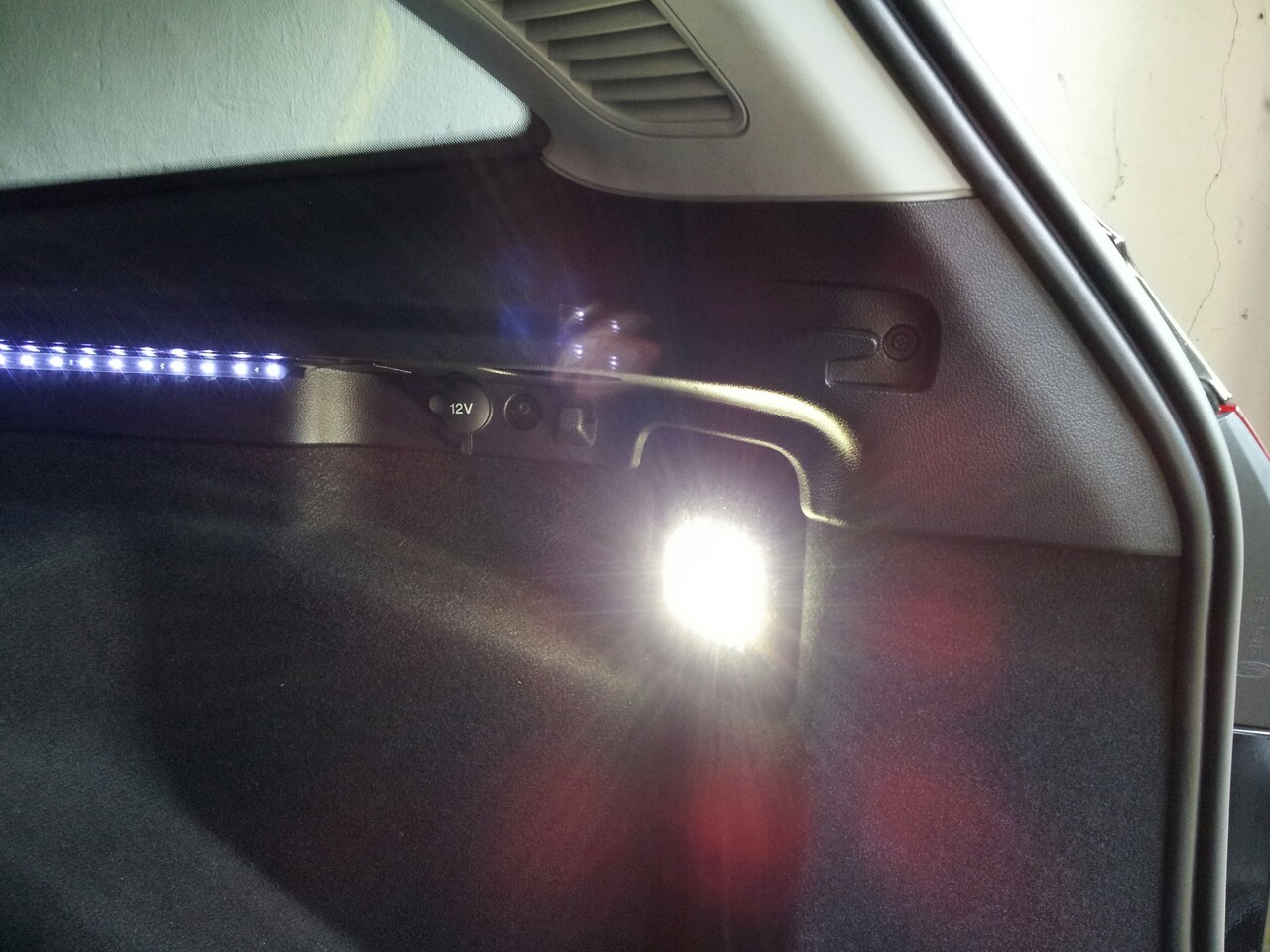 Gesagt, getan, aber nur fast. Wer das Video gesehen hat, erinnert sich, daß Manuel die Transit-Leuchte in die Montageklappe der Rückleuchten in der Heckklappenverkleidung eingebaut hat. Macht beim FL Sinn, da dort schon serienmäßig Licht verbaut ist.