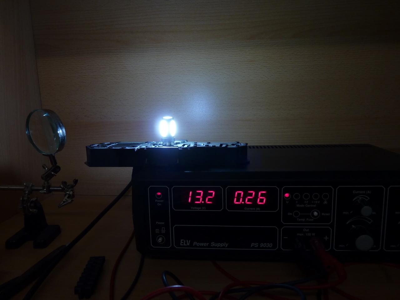 Ich habe einige Tests mit den eingangs erwähnten Rückfahrscheinwerfer-LED’s durchgeführt. Bei 13,2V liegen 0,26A Strom an.