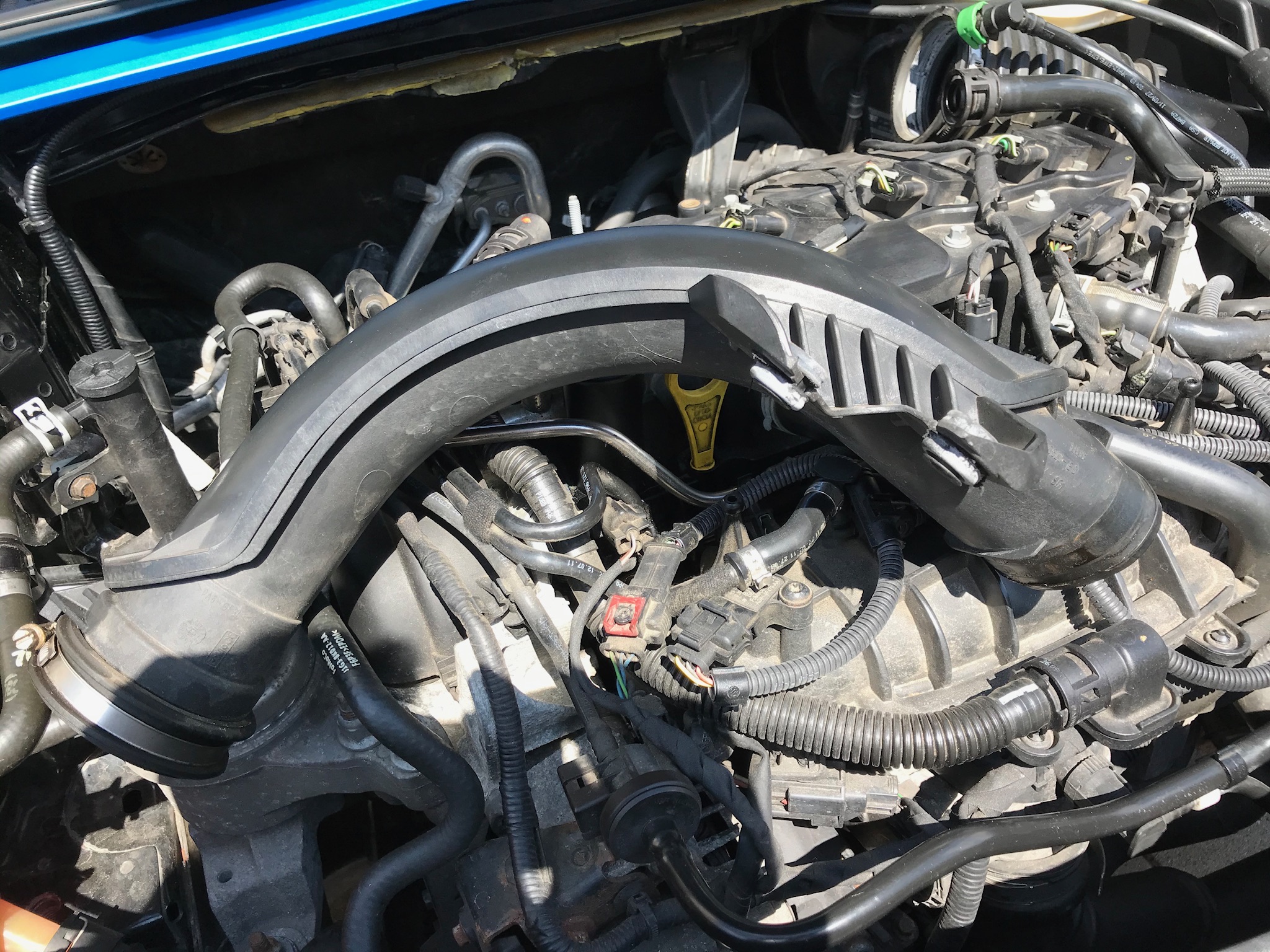 Was war nun los. Kühlwasser kontrolliert und den Rest am Auto. Was mußte ich da sehen? Rohr vergessen am Luftfilter anzuschrauben