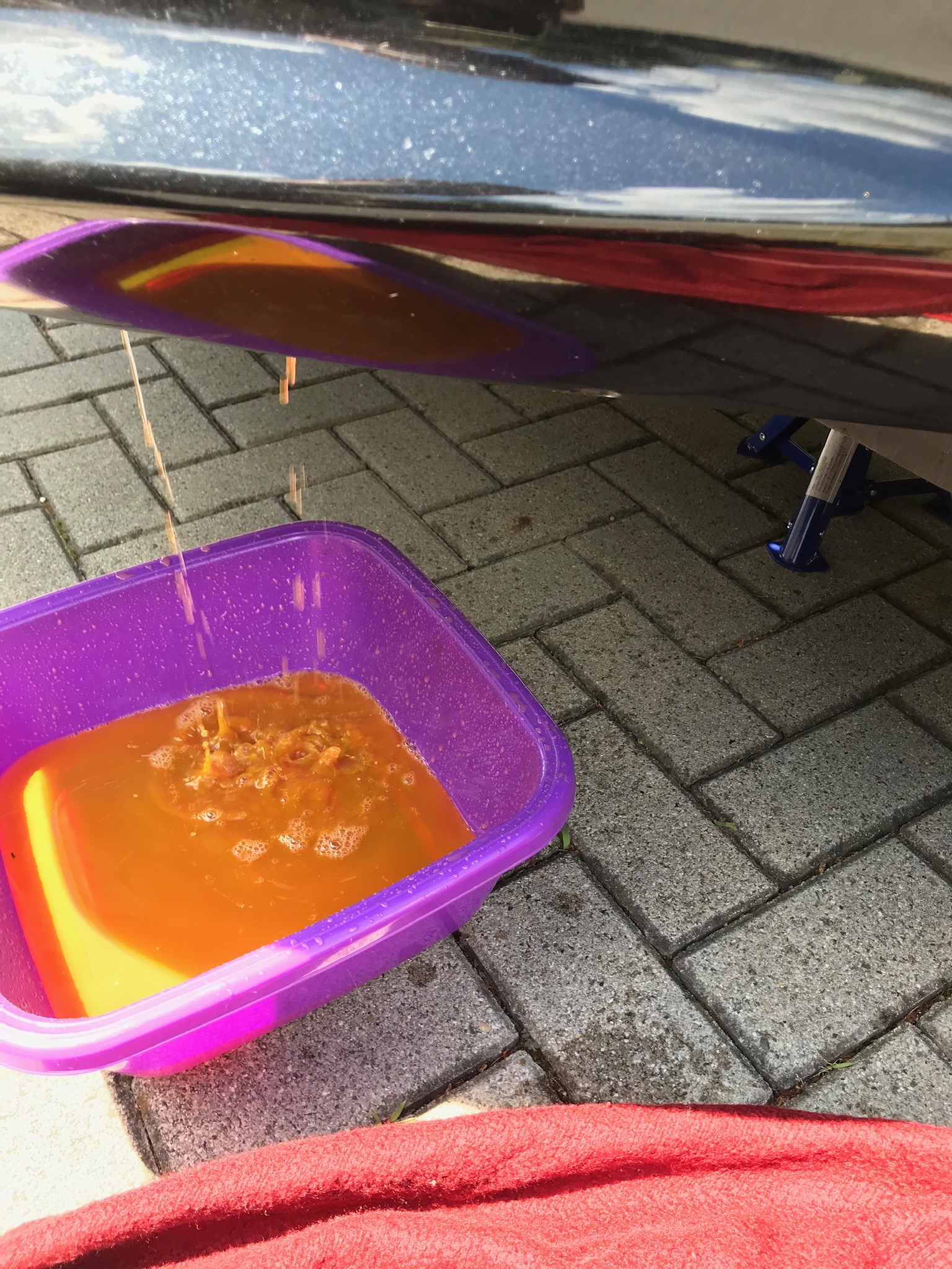 Motor gestartet, kam sofort und hörte sich nicht schlecht an. Kühlwasser noch nachgefüllt. Und da schrie auch schon der andere Schrauber aus der Werkstatt. Sofort ausschalten, Öl!!!!