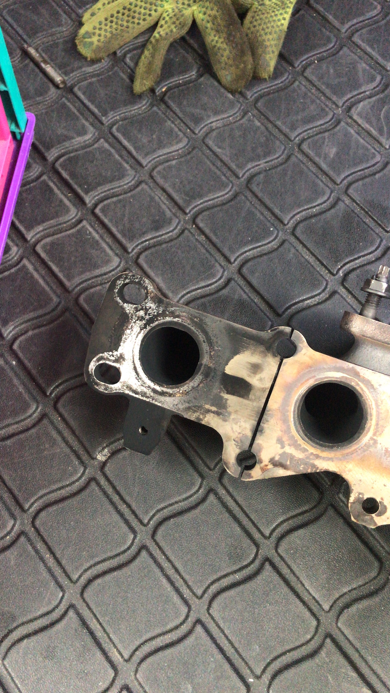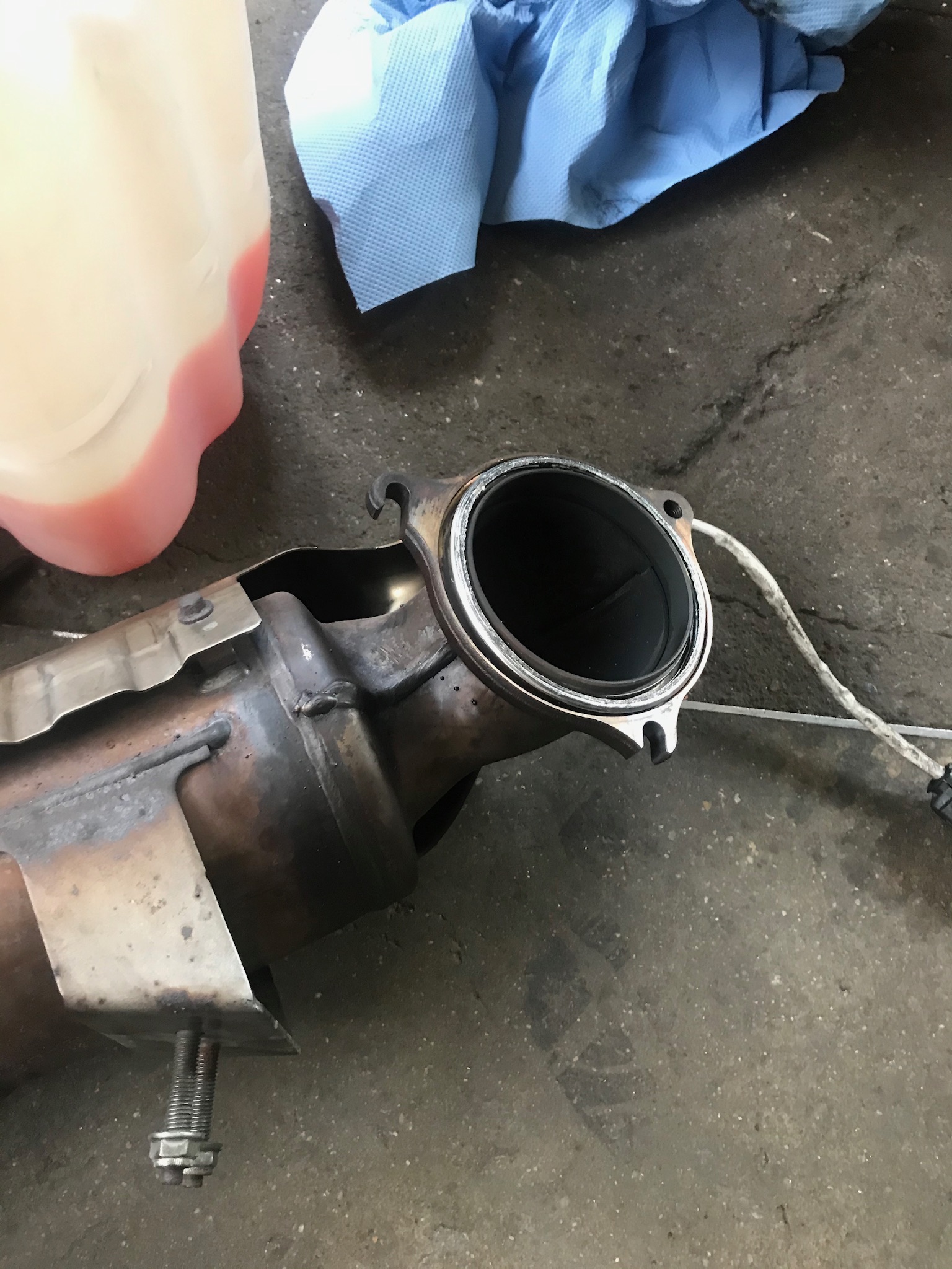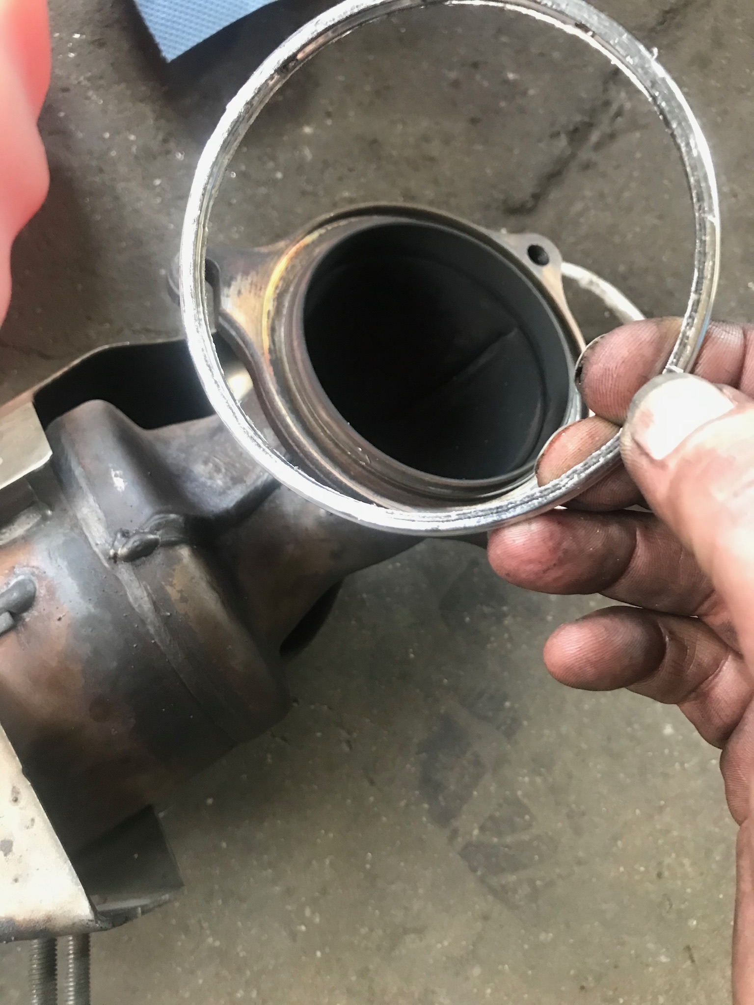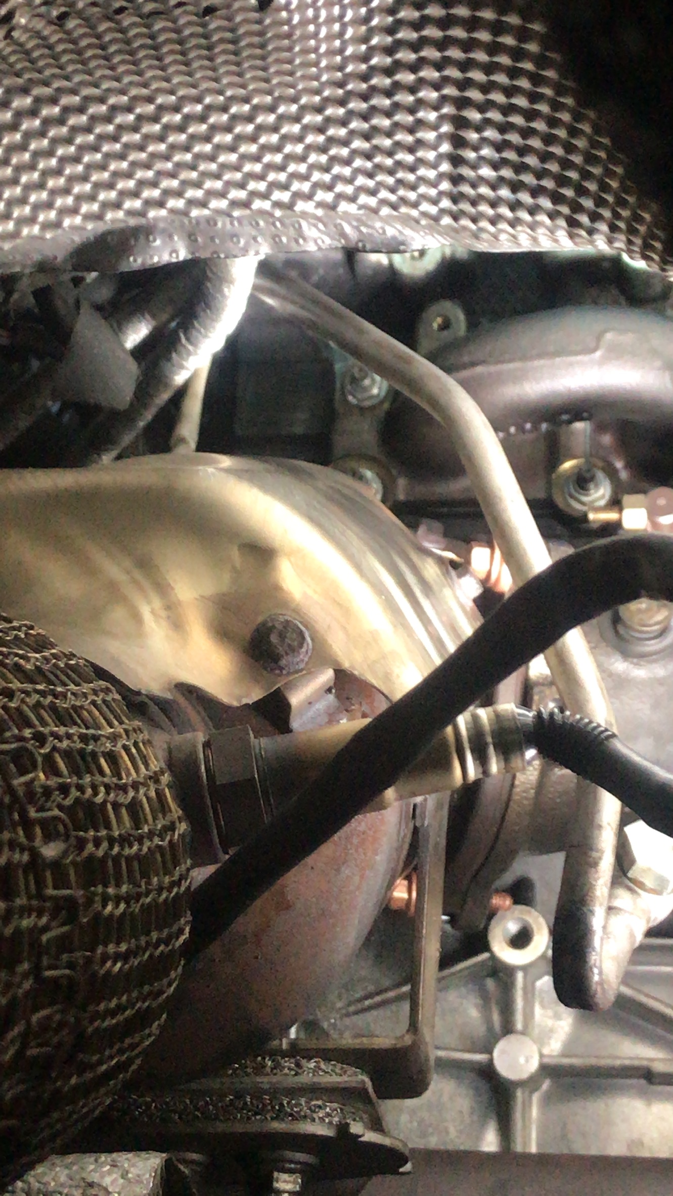 Aber zum Anfang. Bühne hoch, Rest abgeschraubt. Dann die Bolzen versucht mit Schraubendreher und Schlägen zu lösen. Nix. Also gekörnt und angefangen zu bohren. Bohrer Scheixe. Neue gekauft und im Laden war Mittagspause. Also ging es um 14.00 erst weiter. Stunden gebohrt und Gewinde nachgeschnitten. Zum Glück halten die Bolzen. Im vorderen Bereich war das Gewinde kaputt. Aber die BO,Zen gehen ja tief genug rein. Dann alles ausgeblasen, Krümmerdichtung rauf, Krümmer drauf. Alles mit 10nm und Gefühl angezogen. Turbo vom Kat getrennt. Neue Dichtring dazwischen, neue Schrauben. Turbo an den Krümmer, Kat an den Turbo. Hitzeblech auf den Krümmer, Kühlwasserrohre ran an den Turbo, Rohre für Luftzufuhr ran. Dann noch 1/2 Stunde Löcher in den Flansch vom MSD gebohrt, da die Bolzen verrostet waren. Kat und MSD mit Schrauben und Muttern und der Dichtung dazwischen verbunden. Fertig.Kühlwasser noch rein.
