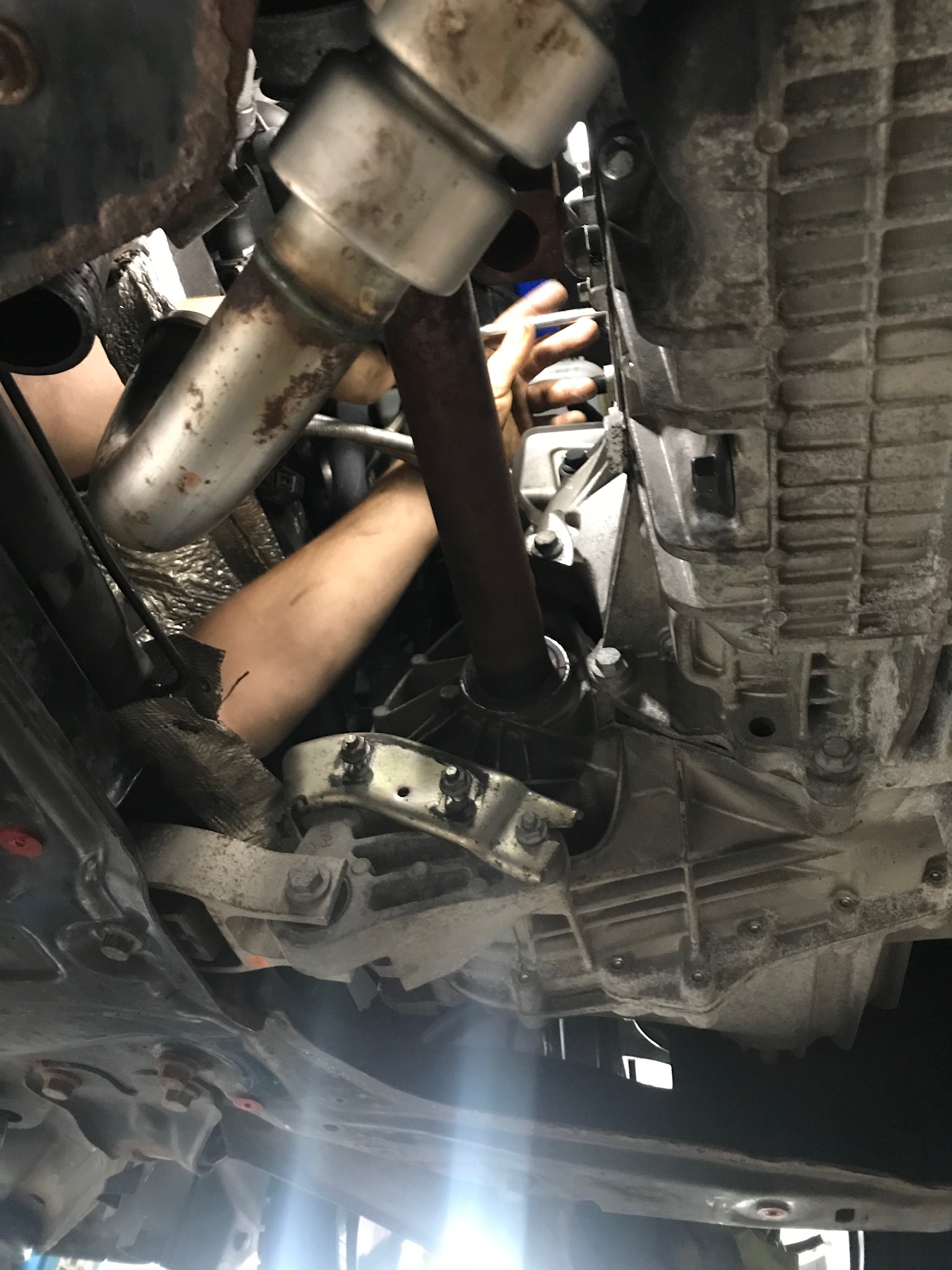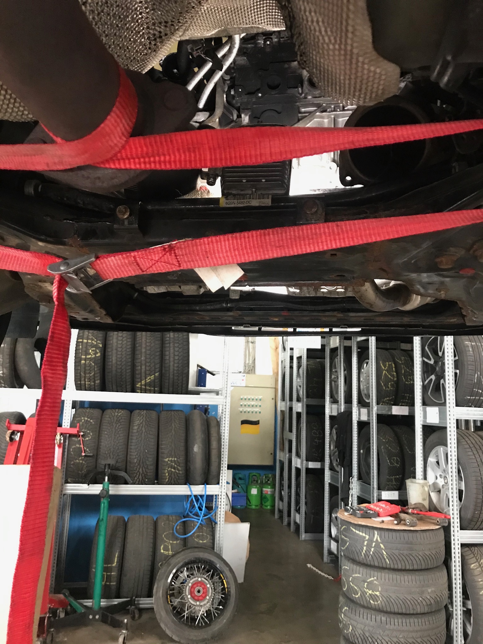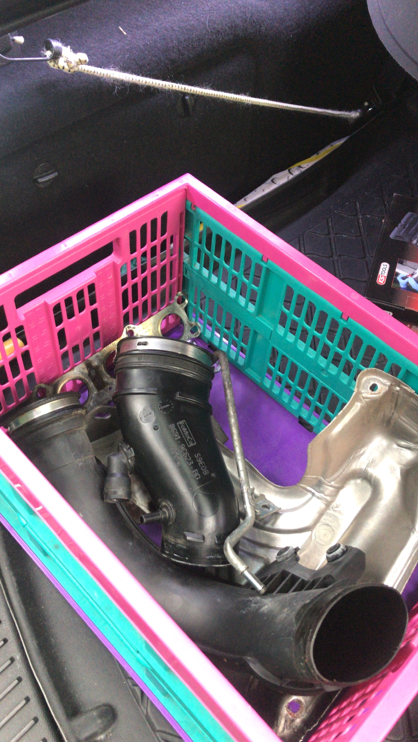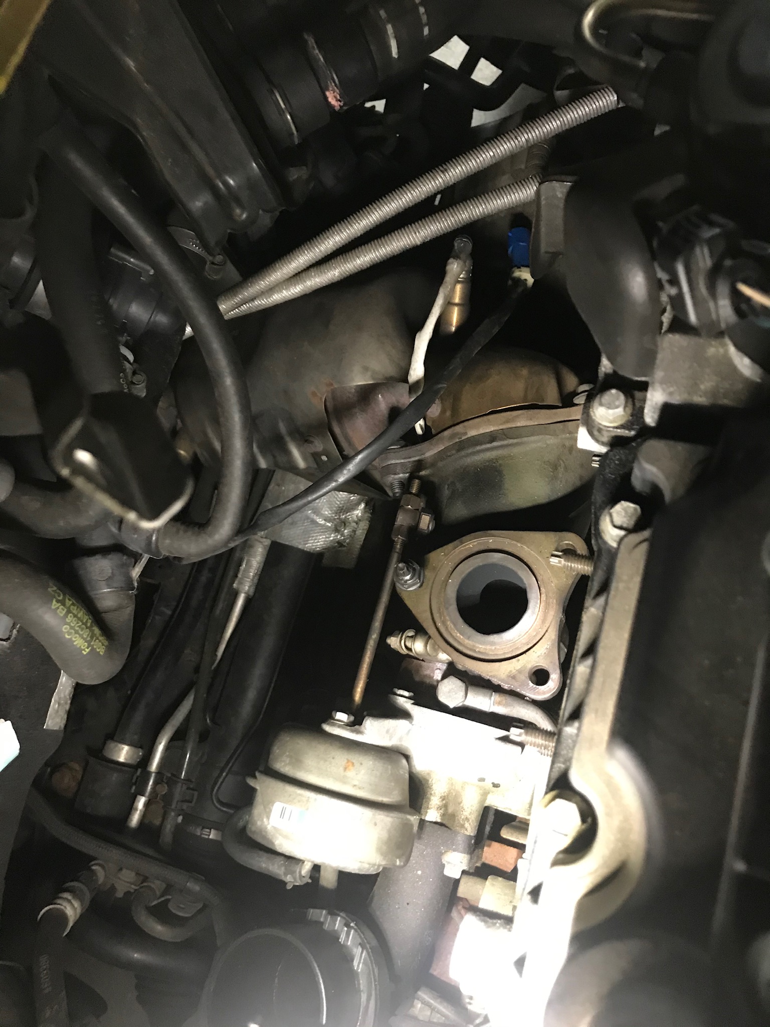 . Heute morgen um 9.00 Uhr hebe ich ihn dann auf die Bühne. Bau dann noch den Rest raus, also Turbo und Kat und dann schauen wir mal ob wir die 2 Scheißerchen da rausbekommen. Dann die 2 neuen Stehbolzen rein, Dichtungen drauf, Krümmer ran, Turbo, Kat, MSD, Kühlwasserrohre. Kühlmittel wieder rein und dann hoffe ich das der Ecoboost wieder läuft. -