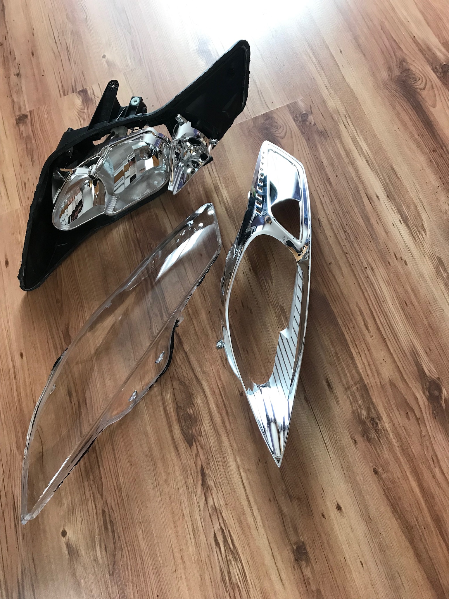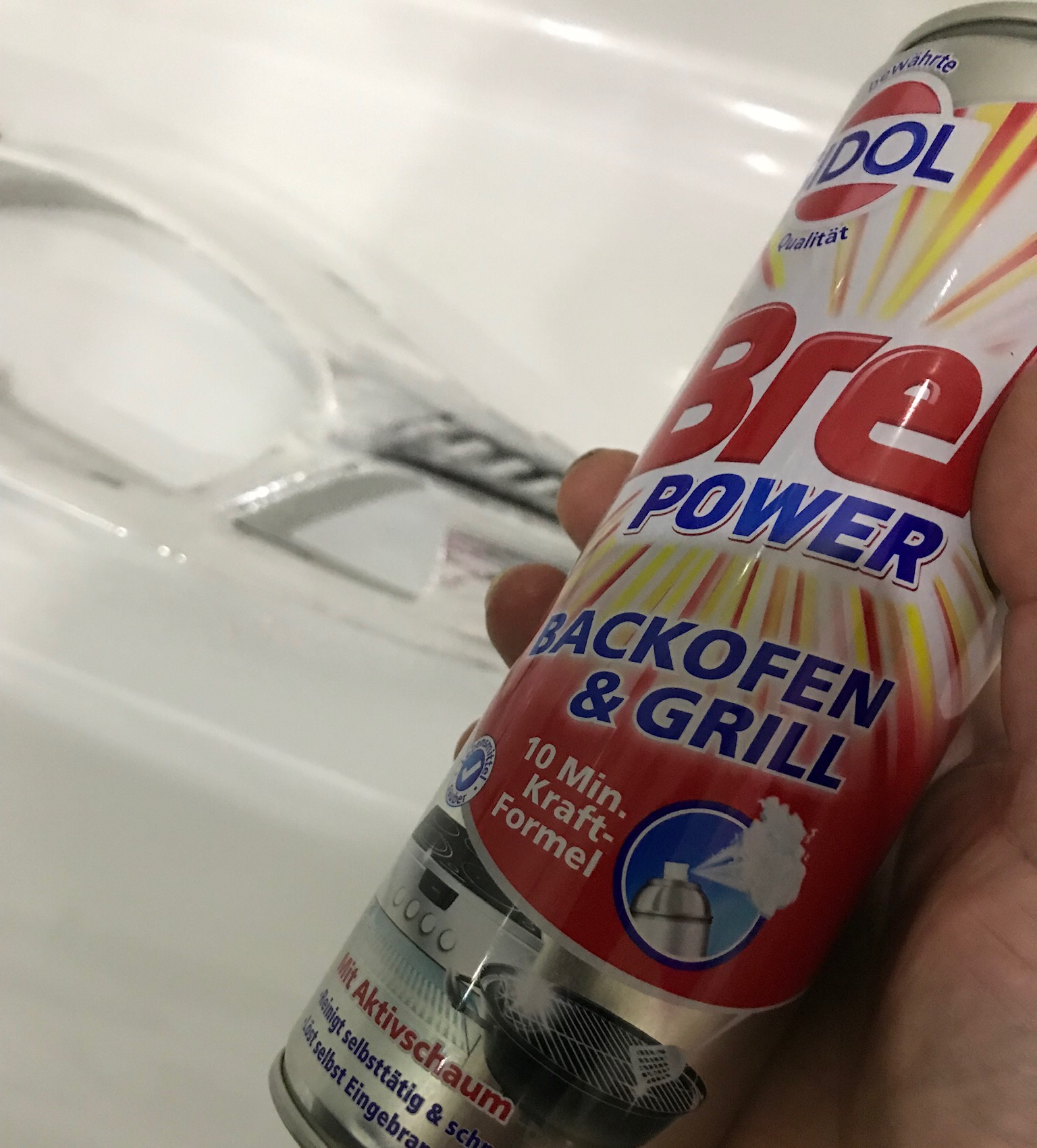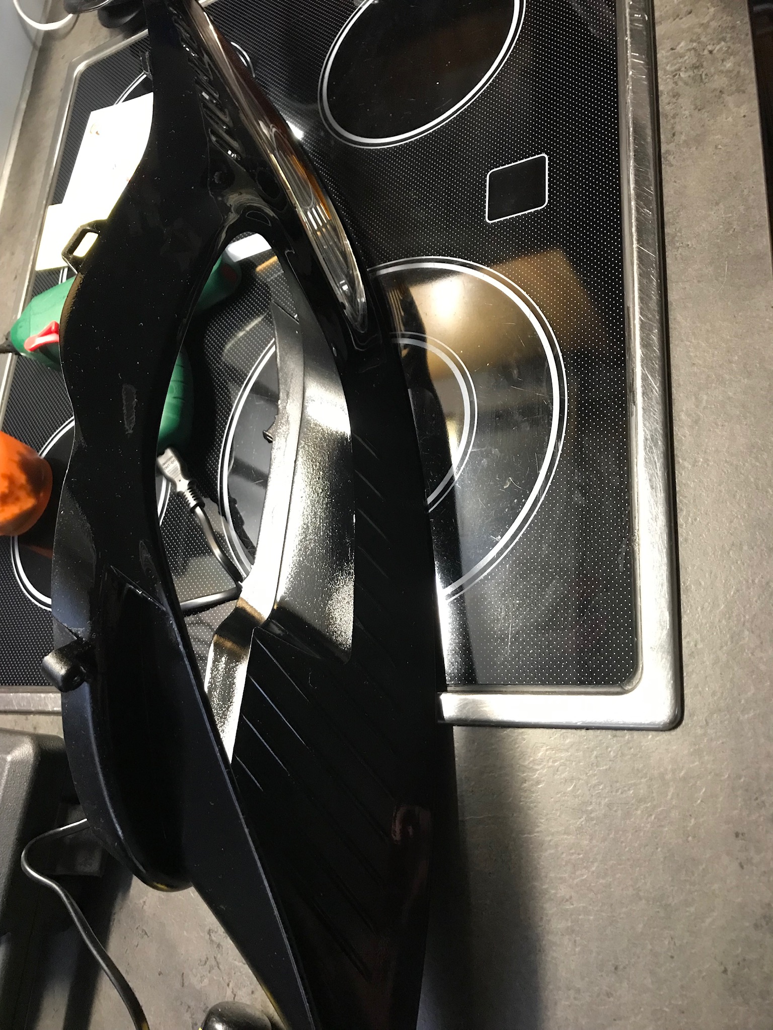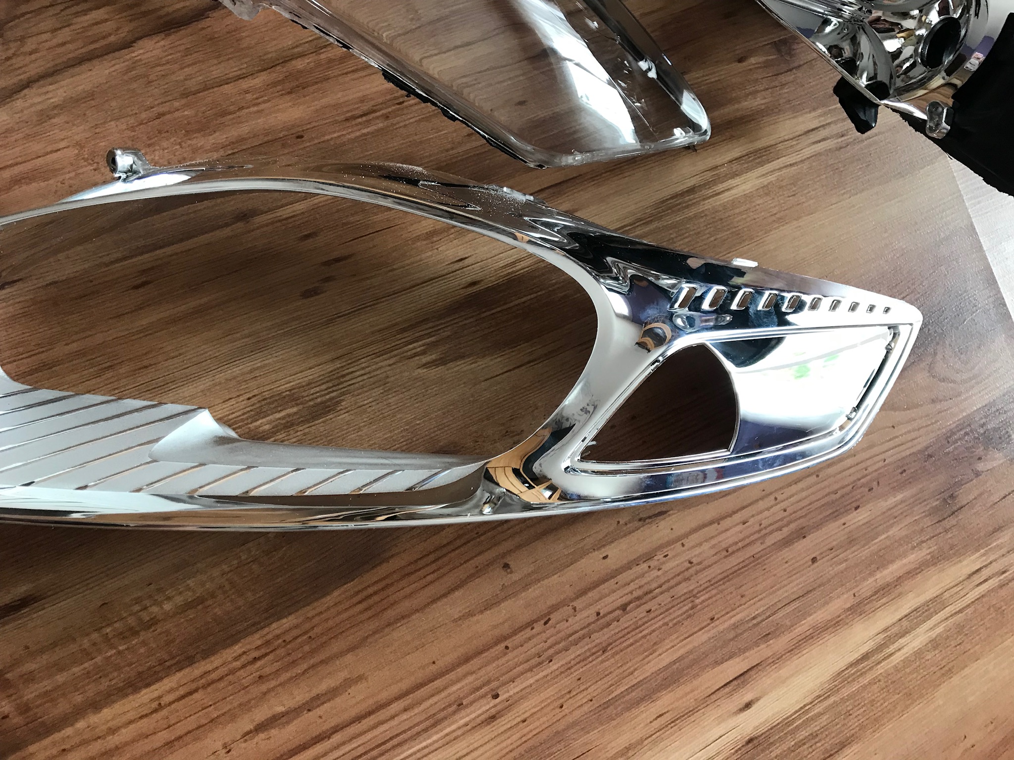 Weiter geht’s. Dremel vom Lidl mußte helfen da der Backofen zu klein und das Plastik danach zu heiß zum anfassen. Nach zig kaputten Trennscheiben ab in den Baumarkt und ein Diamant besetztes Sägeblatt gekauft. Nach 2 Stunden dann endlich die Scheibe ab. Der Chrom geht tatsächlich mit Backofenreiniger sehr gut ab. Das Problem ist aber das das Plastik darunter dann stellenweise fleckig ist. Also mußte ich doch lackieren. Und so wie ich bin mit 100% ist das garnicht so einfach im Keller