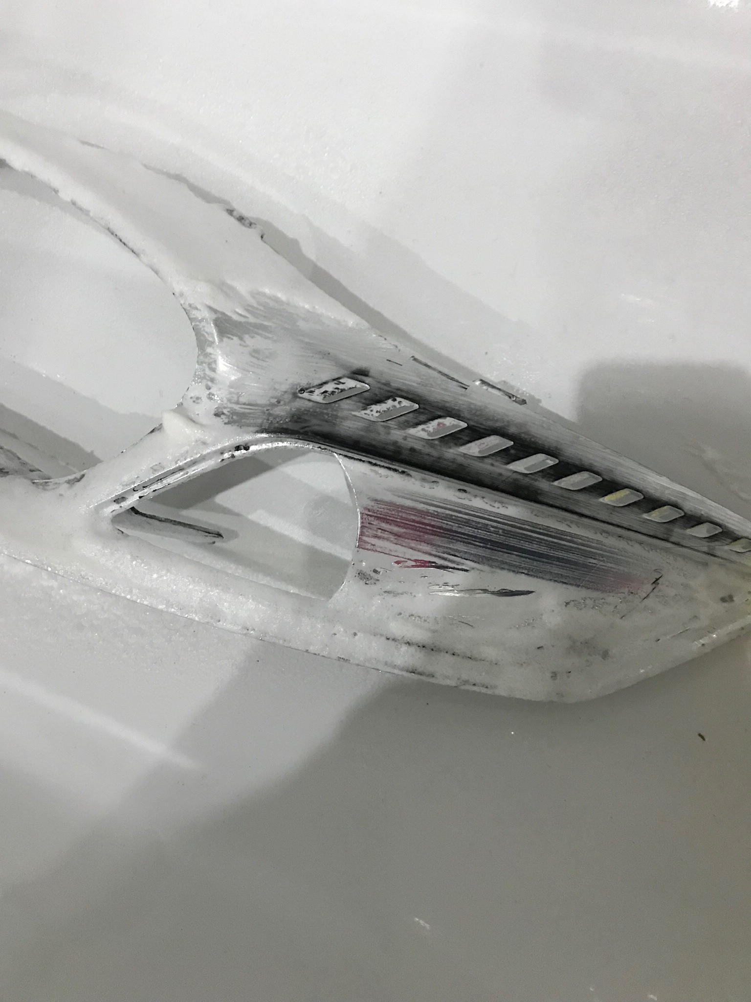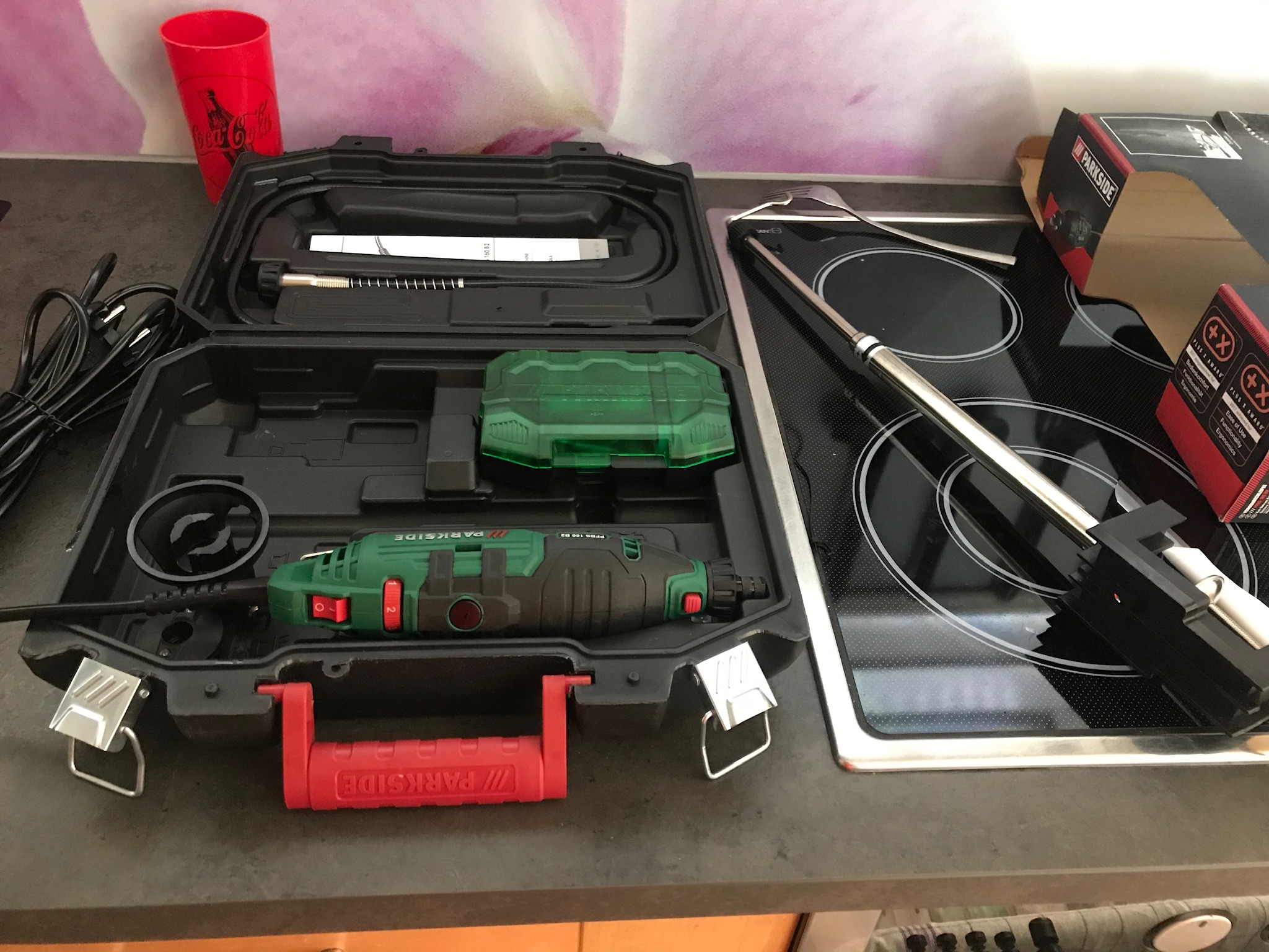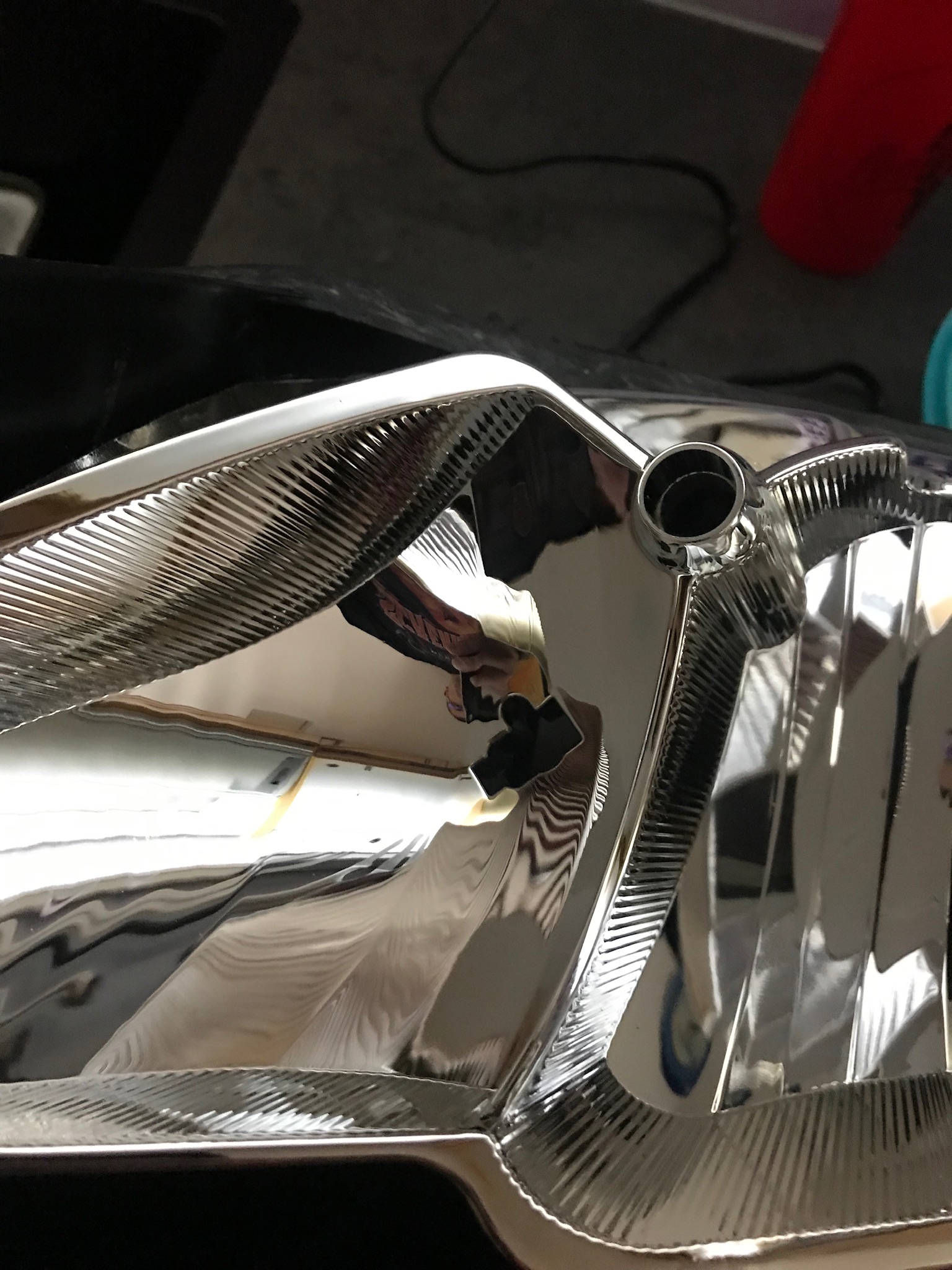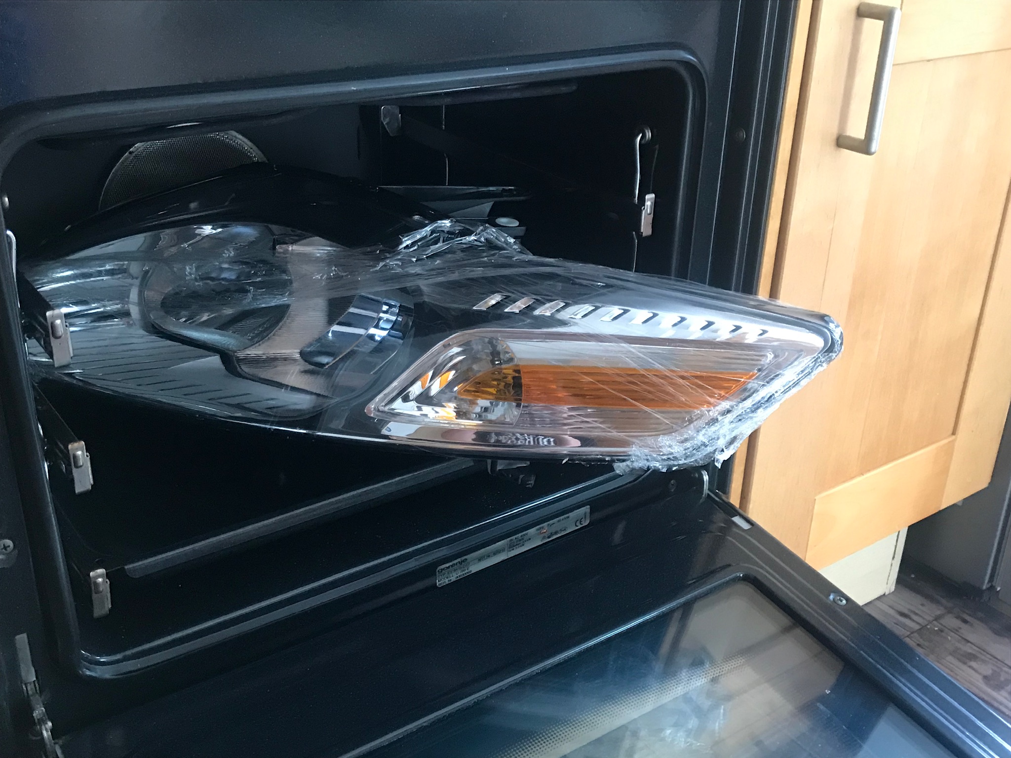 Weiter geht’s. Dremel vom Lidl mußte helfen da der Backofen zu klein und das Plastik danach zu heiß zum anfassen. Nach zig kaputten Trennscheiben ab in den Baumarkt und ein Diamant besetztes Sägeblatt gekauft. Nach 2 Stunden dann endlich die Scheibe ab. Der Chrom geht tatsächlich mit Backofenreiniger sehr gut ab. Das Problem ist aber das das Plastik darunter dann stellenweise fleckig ist. Also mußte ich doch lackieren. Und so wie ich bin mit 100% ist das garnicht so einfach im Keller