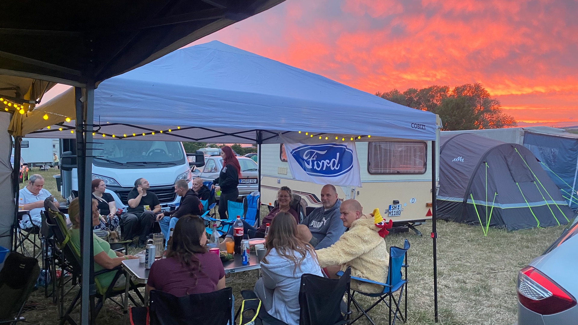 Grill, Kühlbox, Kabeltrommel, Zelt, Stühle, Tisch, Alkohol, Grillkram reicht aus