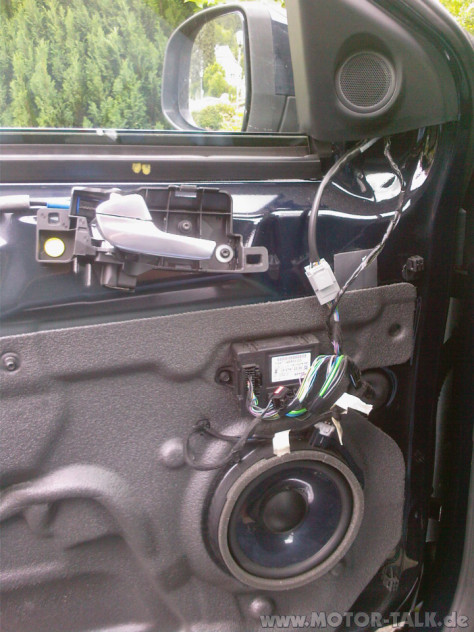 Da habe ich mich wohl etwas unglücklich ausgedrückt. Wenn man die Türinnenverkleidung entfernt hat, dann sieht man den Kabelbaum zum Außenspiegel. Dieser hat etwa in der Höhe der Hochtöner einen Stecker, wo man ihn abstecken kann (im Bild der helle Stecker).