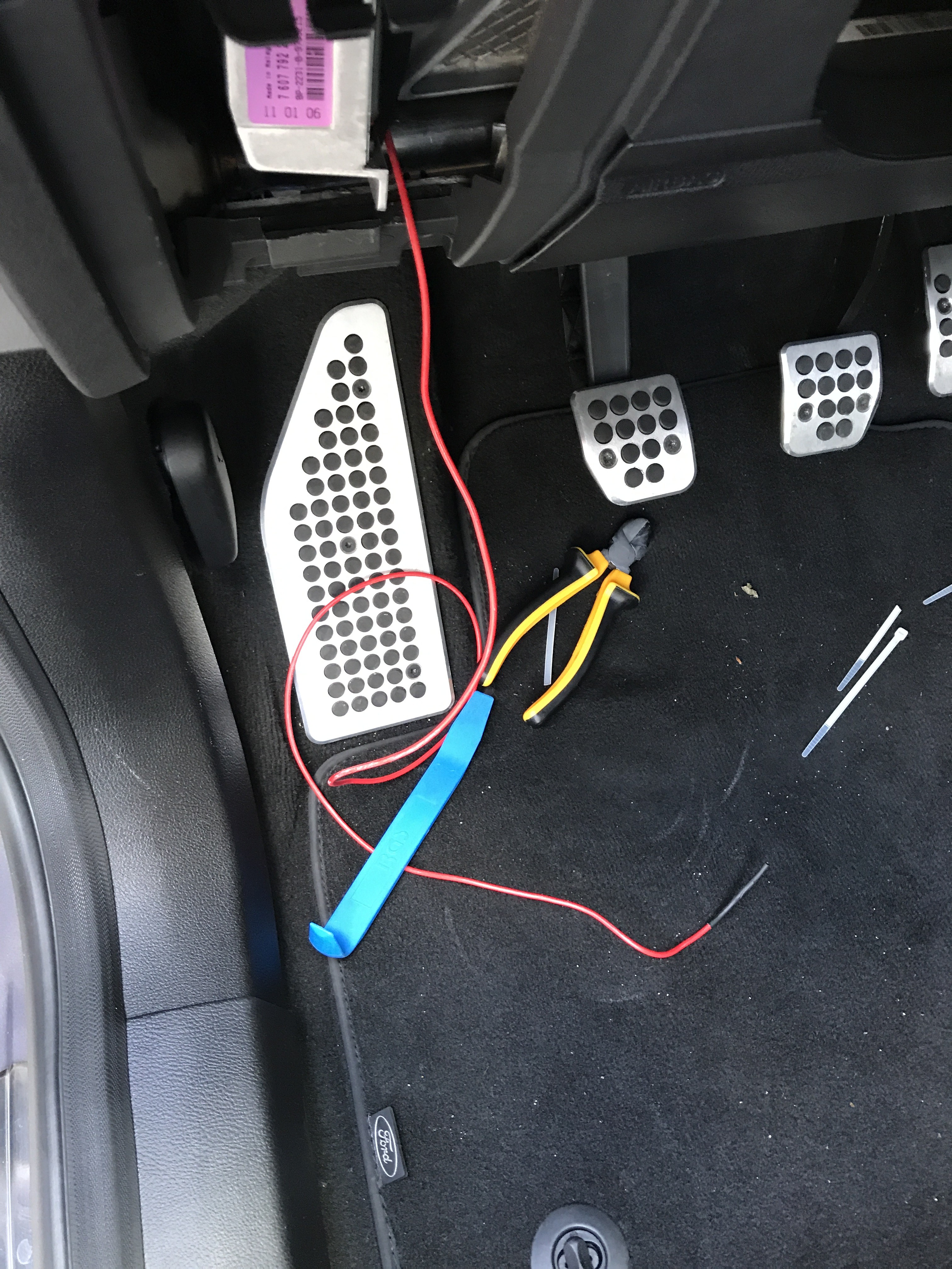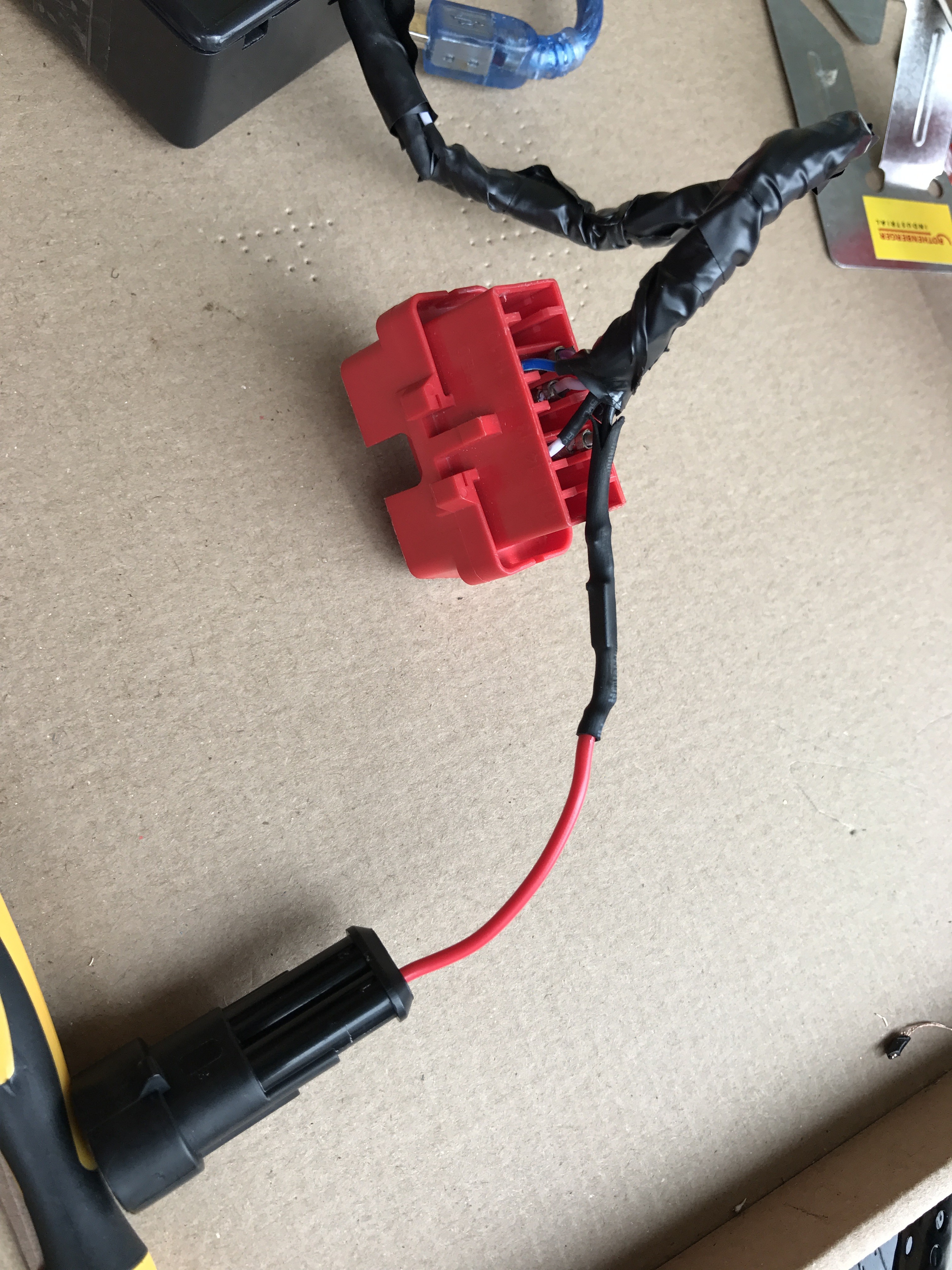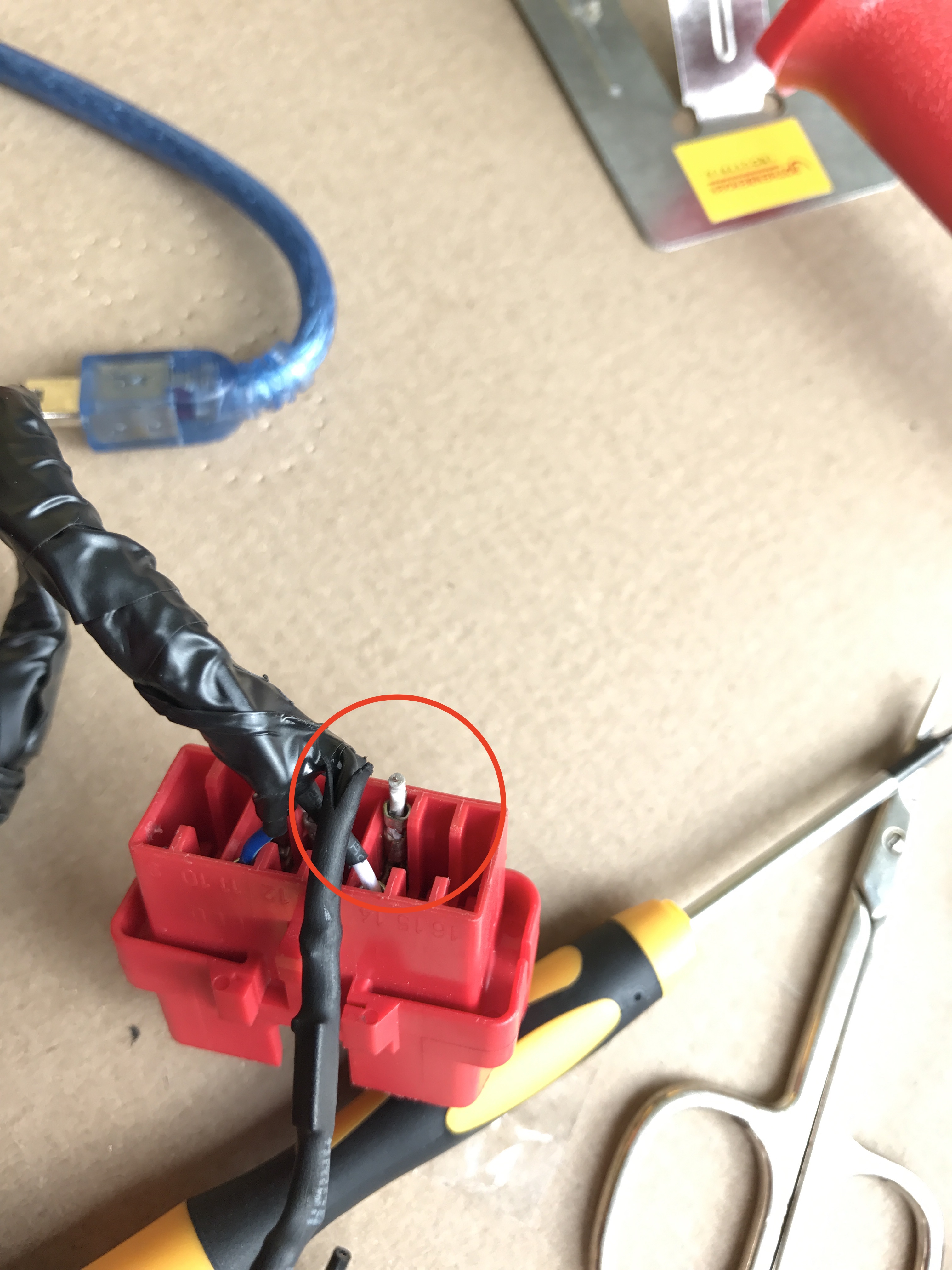 Zwar passt der Adapter rein, die Kabel werden jedoch recht stark nach unten gedrückt sobald die Klappe für das OBD-Fach drauf sitzt. Also unplanmäßig noch mal alles raus und gefixt. evilgrin Planmäßig wurde Pin 16 wie beschrieben ausgepinnt und an eine Kupplung für das Zündplus-Kabel gelötet: