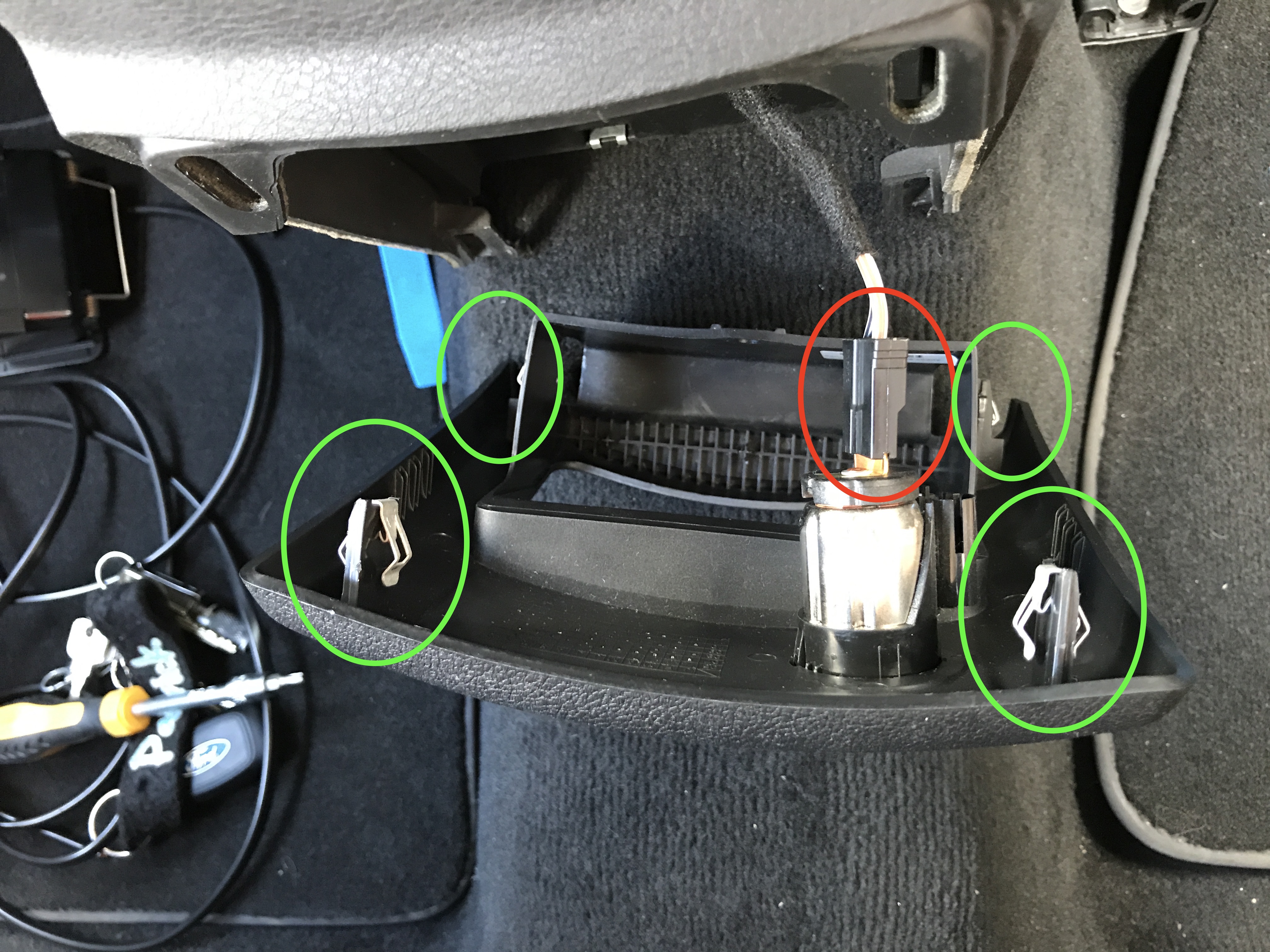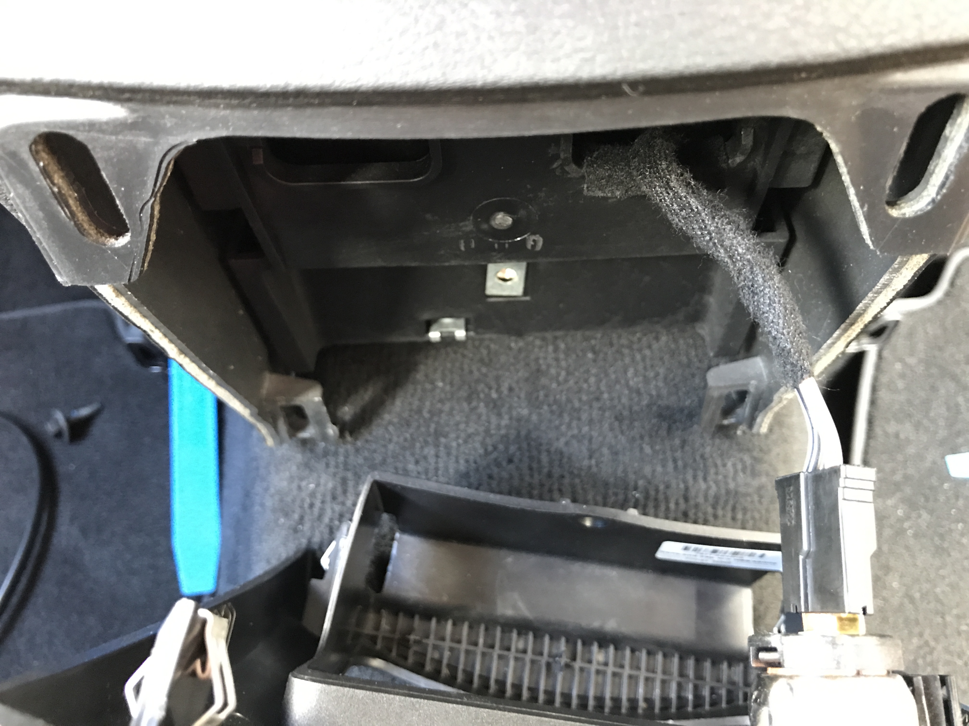 Das Kabel kann dann schön von innen nach außen geführt werden. Am einfachsten ging es bei mir, wenn man zunächst das Kabel hinter die Blende geschoben hat (analog zum Stromkabel, an das man sich angfeflanscht hat) und dann das Kabel auf der linken Seite am untren Ende der Konsole auf der Außenseite heraus führt. Schraube an der Konsole (10er Nuss) unten gegenüber dem Fahrersitz lösen und dann einfach unter der Blende weiter nach vorne ziehen.
