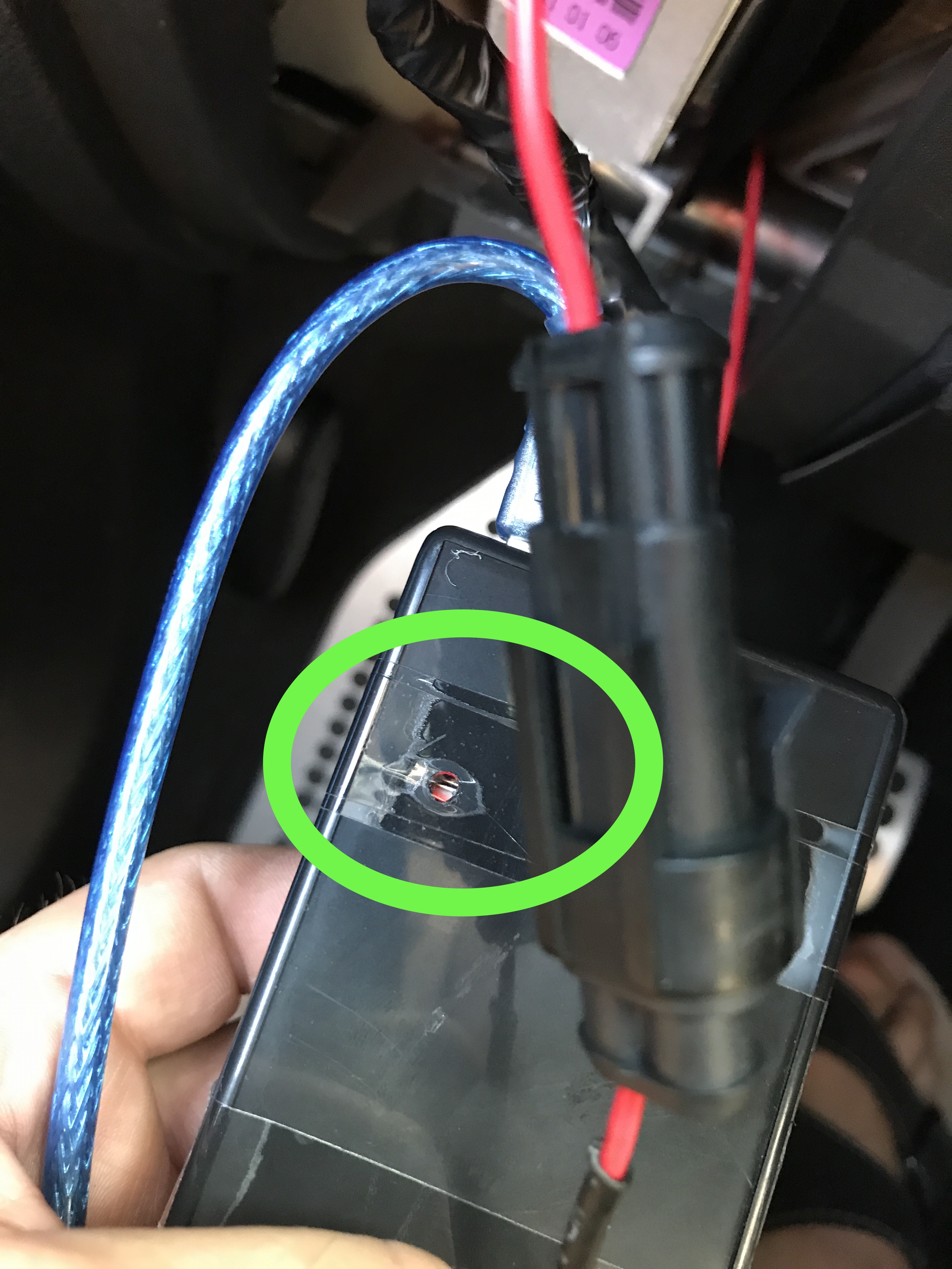 Mit Strom über das Zündunbgsplus-Kabel läuft es (grün), ohne Spannung auf dem Kabel bzw. zur Simulation abgesteckt nicht (rot). So war das gewünscht. Da der hintere Zigarettenanzünder erst verzögert ausgeschaltet wird läuft der Adapter ohne Zündung ein wenig nach.