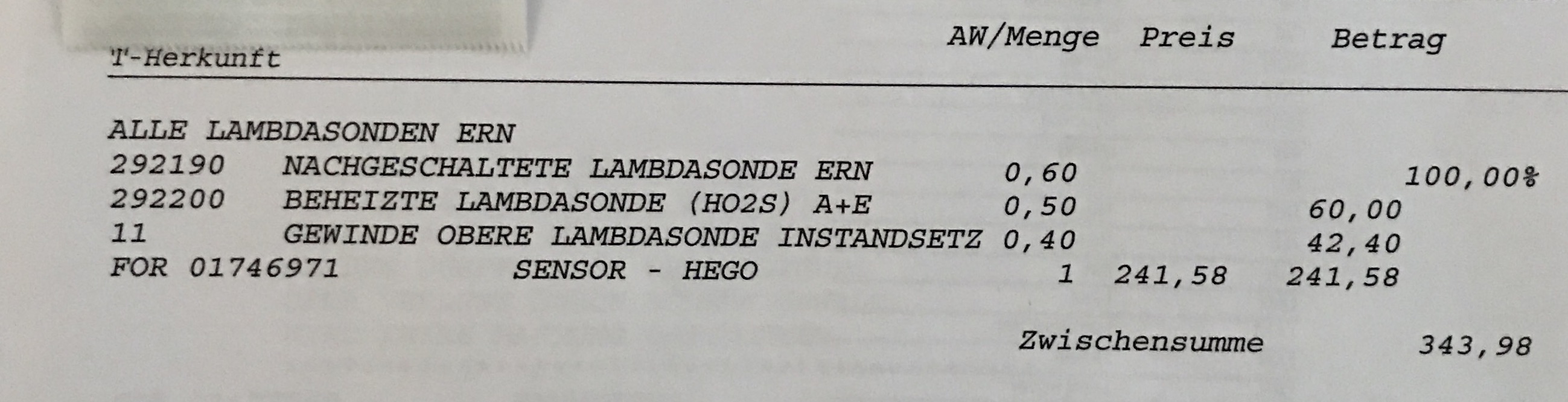 Der Wagen war am Montag bei der Inspektion. Im Vorfeld hatte ich ja ein Angebot (siehe oben) angefordert. Leider gab es wohl ein kommunikatives Missverständnis bei der Auftragsentgegennahme. Obwohl ich mich mit dem Kundenbetreuer noch lang darüber unterhalten habe wurden blöder weise beide Sonden getauscht (vor und nach dem Kat). Als ich am Dienstag dann die Rechnung sah bin ich erst mal aus allen Wolken gefallen. Fast 1500€ für die 6 Jahres Inspektion, Räder wechseln und die beiden Lambda Sonden. Also erst mal die Kundenberater um Klärung gebeten. Ich musste dann fast 2h warten bis ich den Wagen mitnehmen konnte. Die Sonde nach dem Kat wurde wieder ausgebaut und es gab immerhin noch mal 10% auf einige der Posten auf der Rechnung. Insgesamt trotzdem ärgerlich und immer noch knapp 1053€...